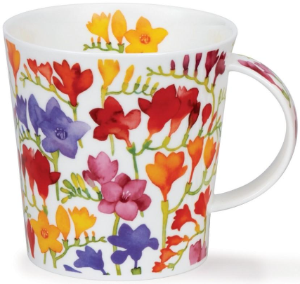 Frezii colorate în acuarelă, în tonuri proaspete și frumoase de roz, roșu și galben, se împletesc și acoperă aceste cești de sus până jos cu culoare și vioiciune.
