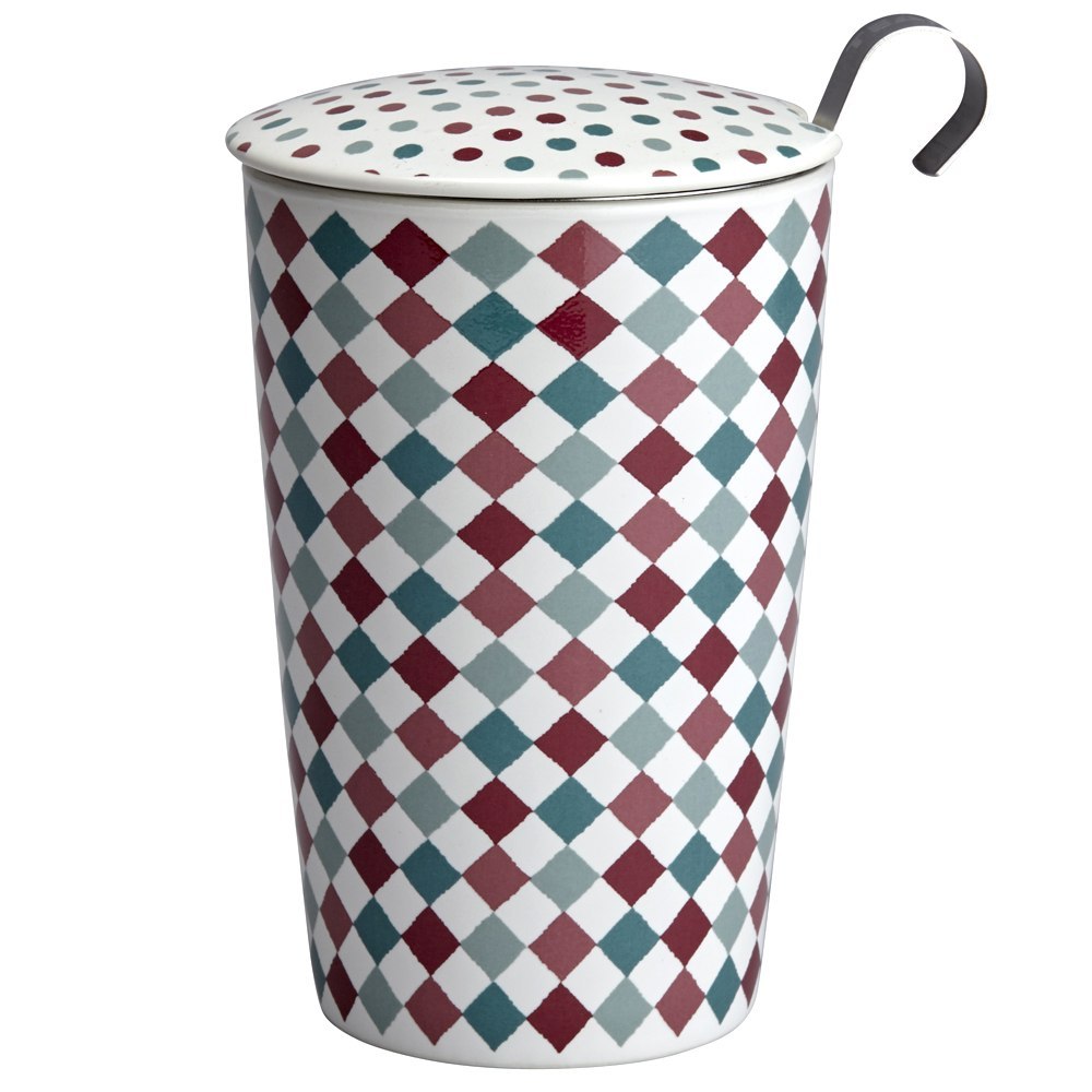Cană din porțelan prevăzută cu sită și capac având pereți dubli pentru a vă menține băutura caldă cât mai mult timp posibil.