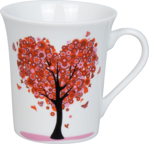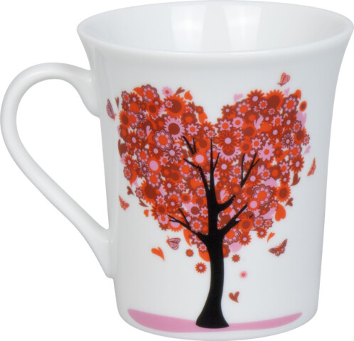 Cană din porțelan ilustrată cu copac înflorit simbolizând dragostea și tandrețea.