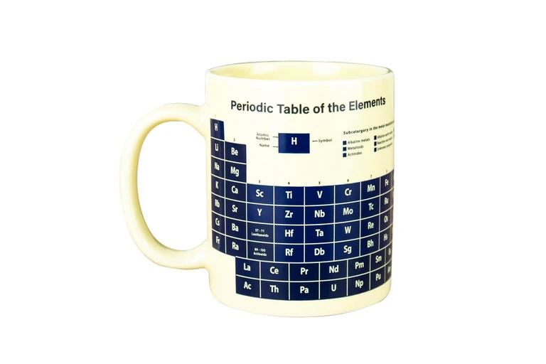 Toarnă lichid fierbinte în această cană și urmărește cum tabelul periodic se transformă sub ochii tăi, elementele schimbându-și culorile și prinzând viață.