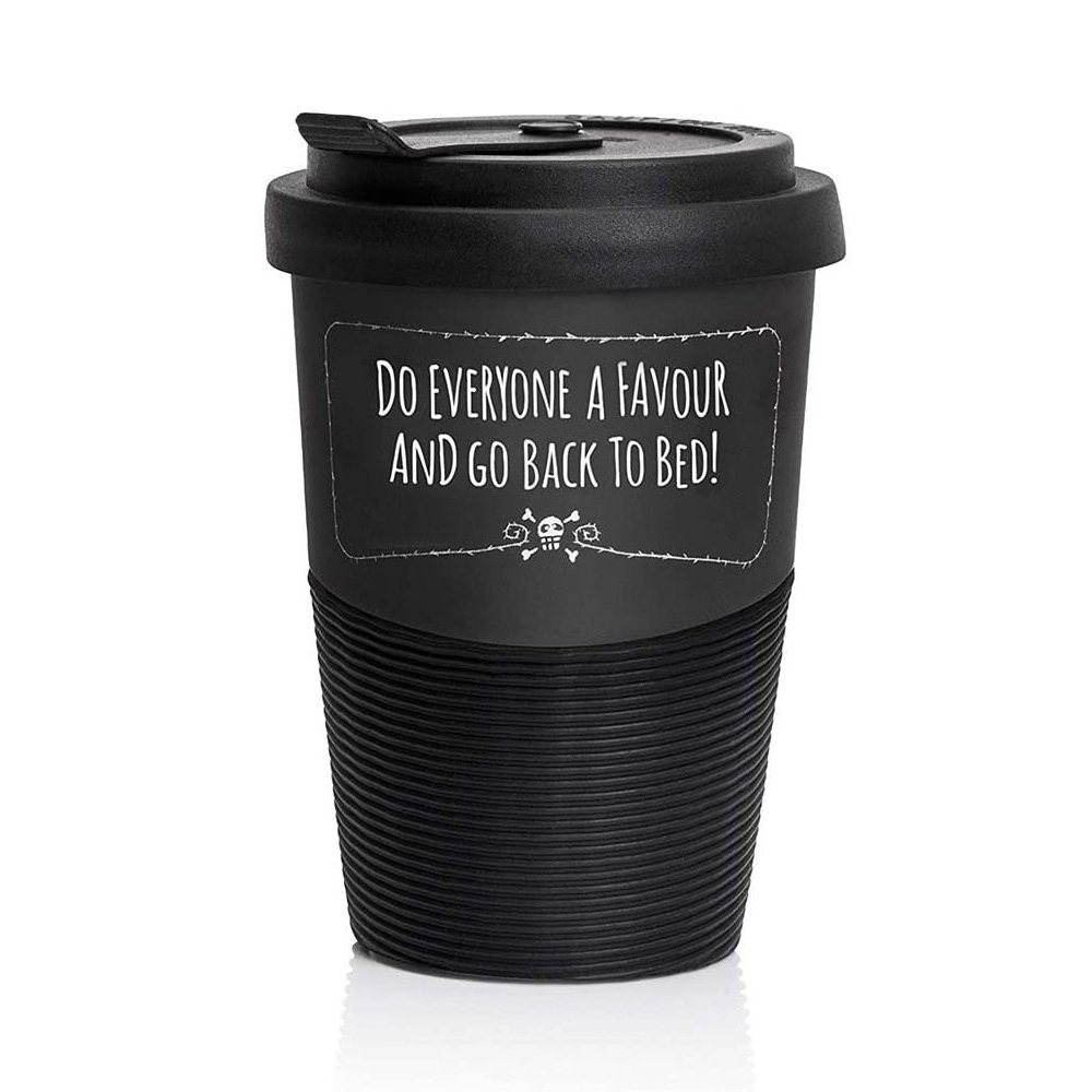 Cană de voiaj fabricată din porțelan, cu mesaje demotivațional - "Fă-ne tuturor o favoare și du-te la culcare "- pentru a înveseli ziua celor cu simțul umorului.
