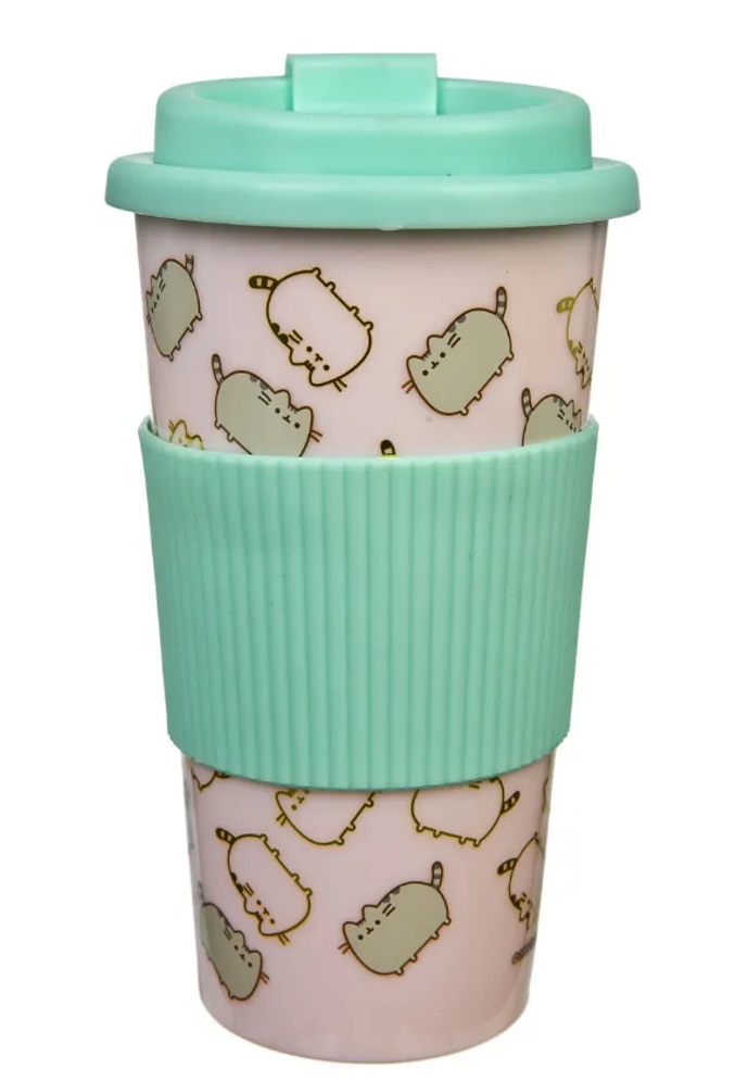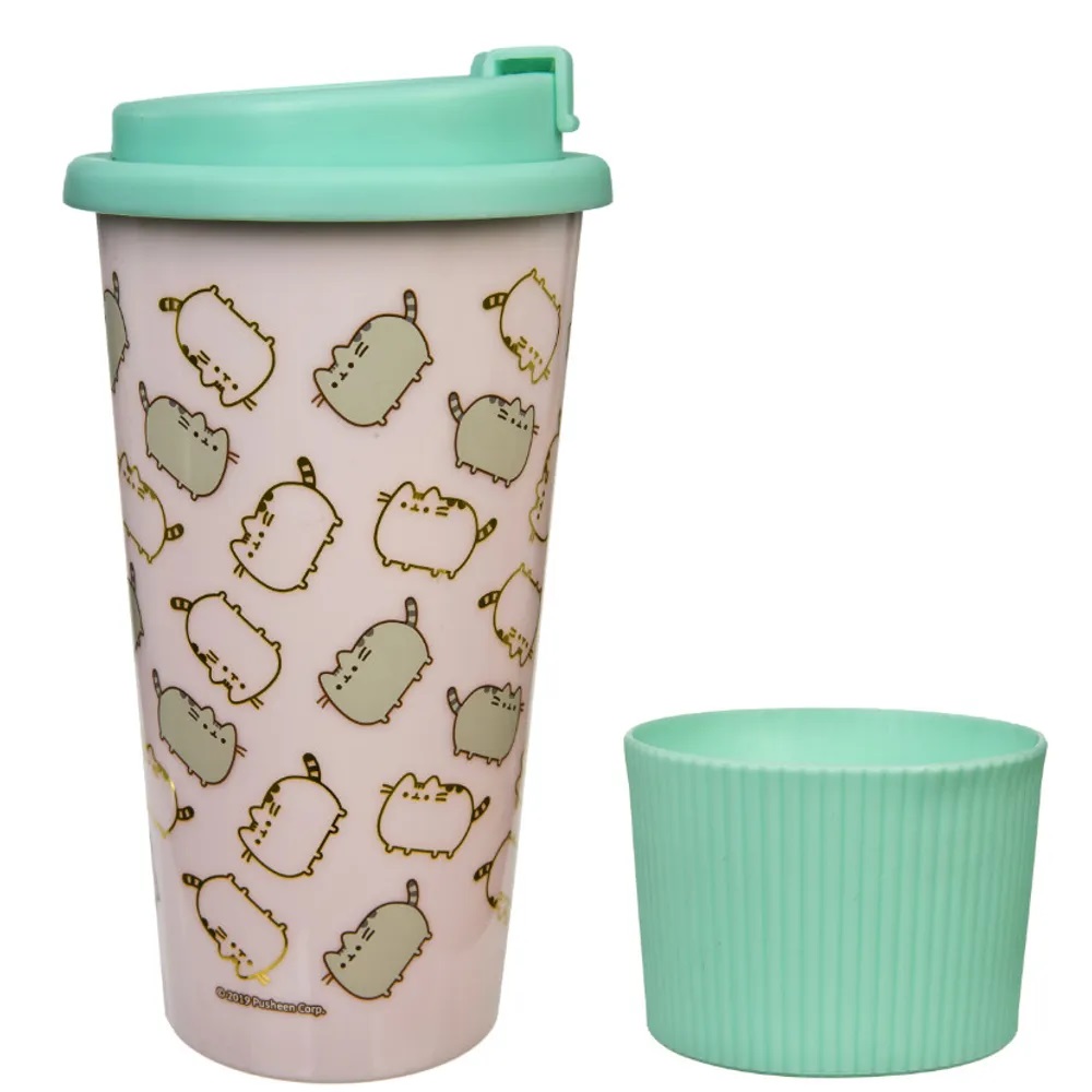 Cană de voiaj pentru fanii Pusheen pentru băuturi calde și reci. Manșonul și capacul sunt realizate din silicon.