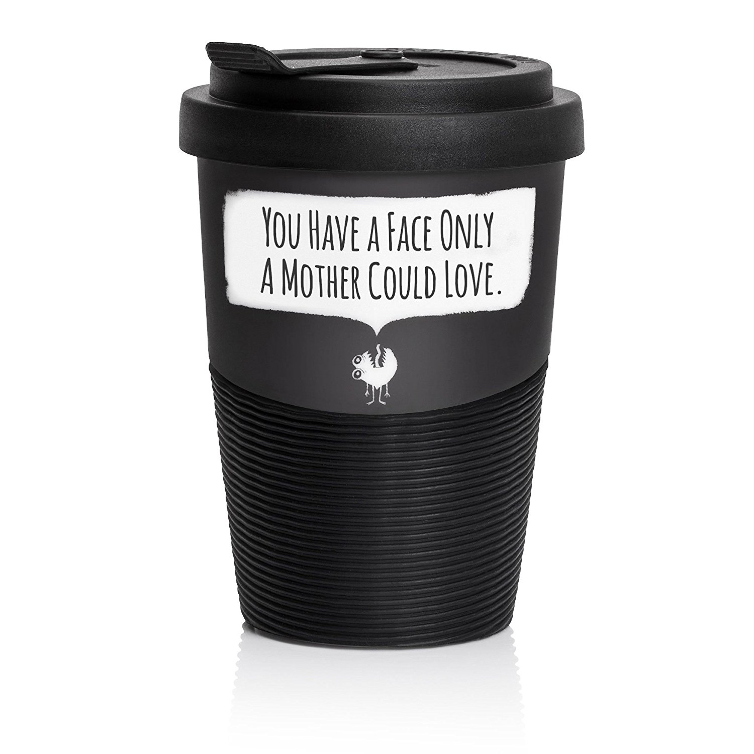 Cană de voiaj fabricată din porțelan, cu mesaj demotivațional - "Ești atât de frumos încât doar o mamă ar putea vedea asta" - pentru a înveseli ziua celor cu simțul umorului.