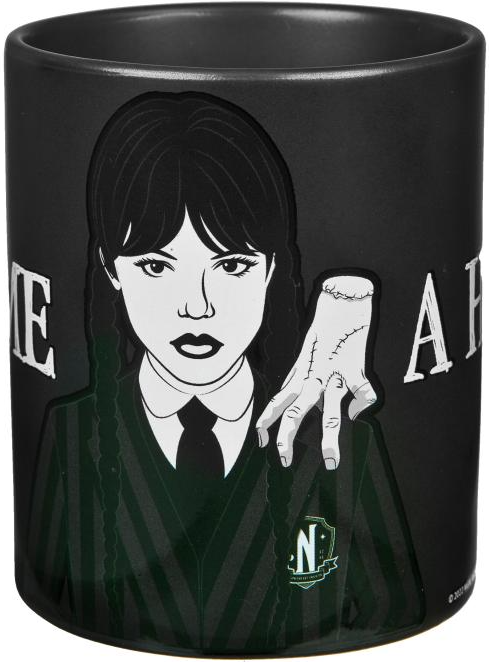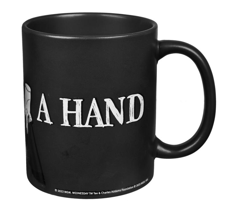 Designul negru, combinat cu motivul emblematic „Miercuri” și inscripția „Dă-mi o mână de ajutor”, face ca această cană să atragă atenția în orice bucătărie.