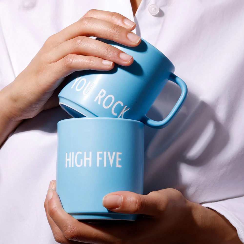 Această cană albastră din porțelan de la Design Letters, cu textul „You Rock” gravat subtil, este perfectă pentru cei care apreciază designul scandinav curat și mesajele motivaționale.