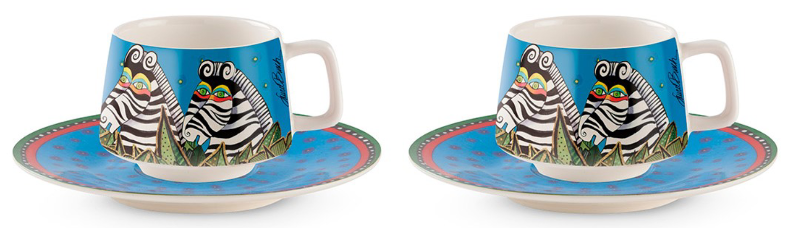 Set de 2 cești cu farfurioare cu o înfățișare exotică, colorată și magică. Universul lui Laurel Burch continuă să aducă bucurie prin colecția Jungle!