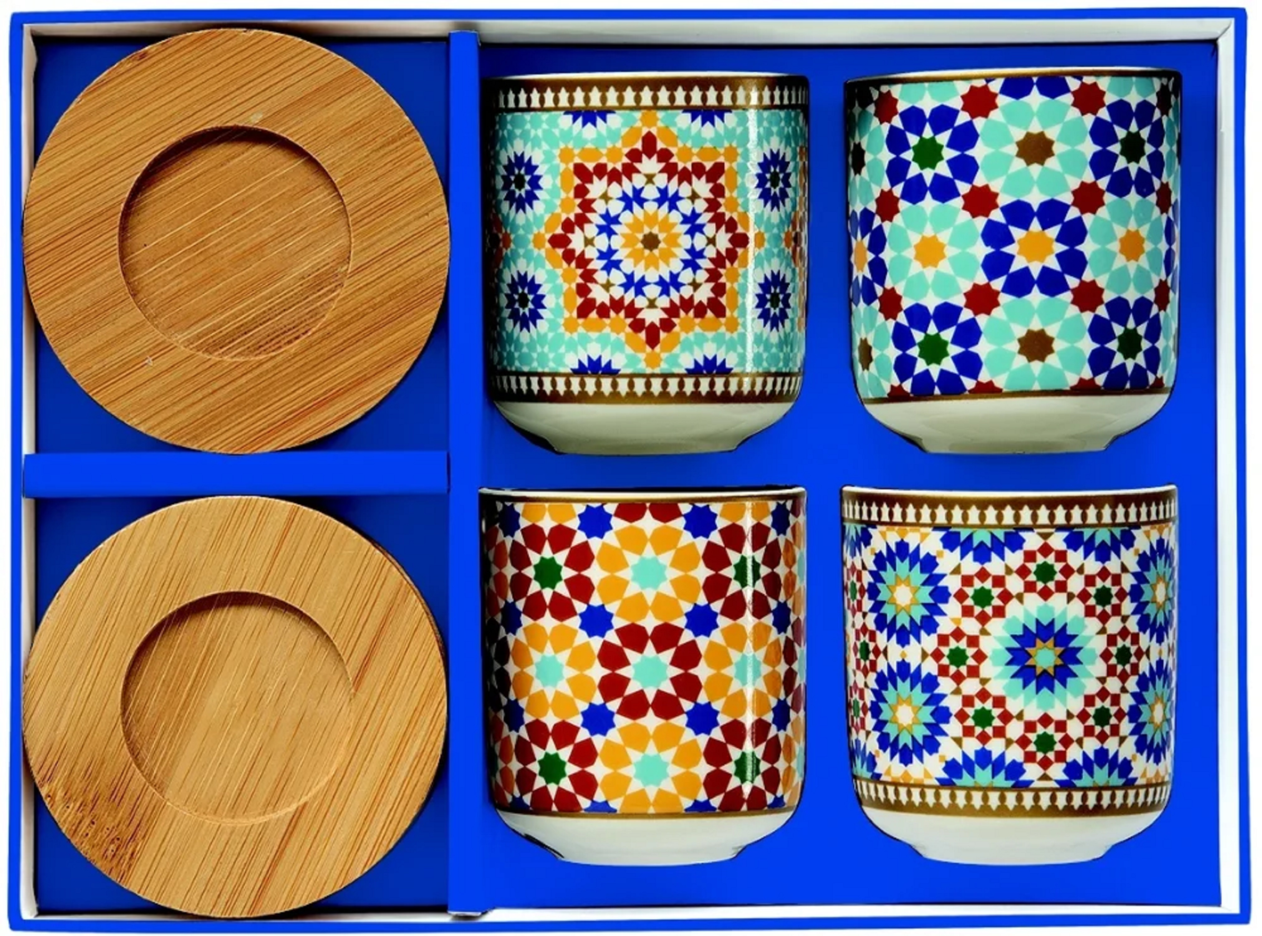 Aceste 4 cești sunt de porțelan, având farfurioare din bambus.