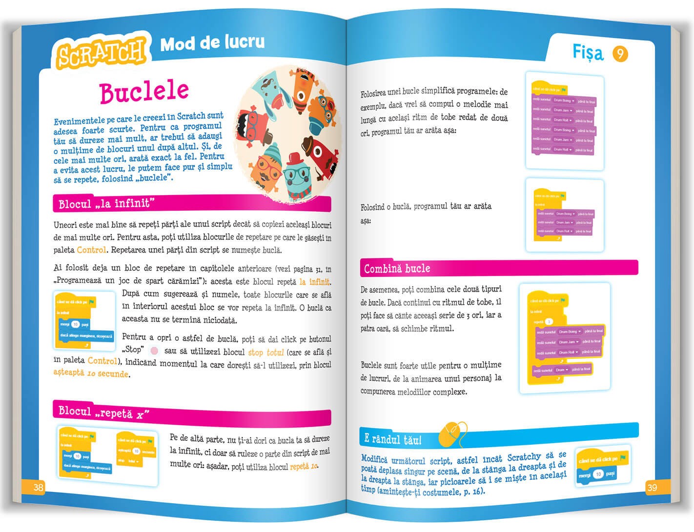 ● Fișe explicative pentru a înțelege pe deplin programarea în Scratch, pentru a testa toate posibilitățile și pentru a vedea dacă ai înțeles corect.