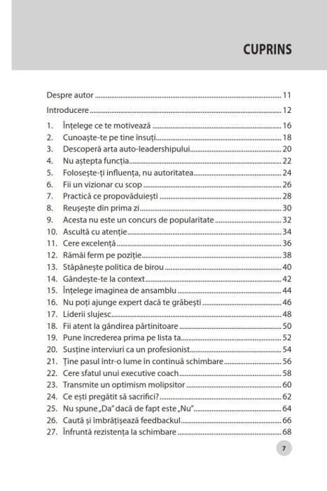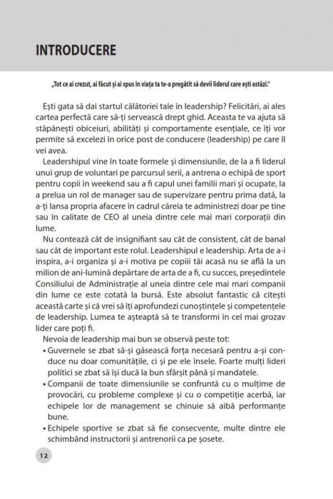 Fiecare capitol combină idei noi cu activități și exer¬ciții menite să te ajute să devii un lider talentat și să-ți dezvolți un stil de leadership puternic și inteligent. Fie că deschizi cartea la întâmplare sau o citești de la început până la sfârșit, pe fiecare pagină vei găsi sfaturi inspiratoare și practice.