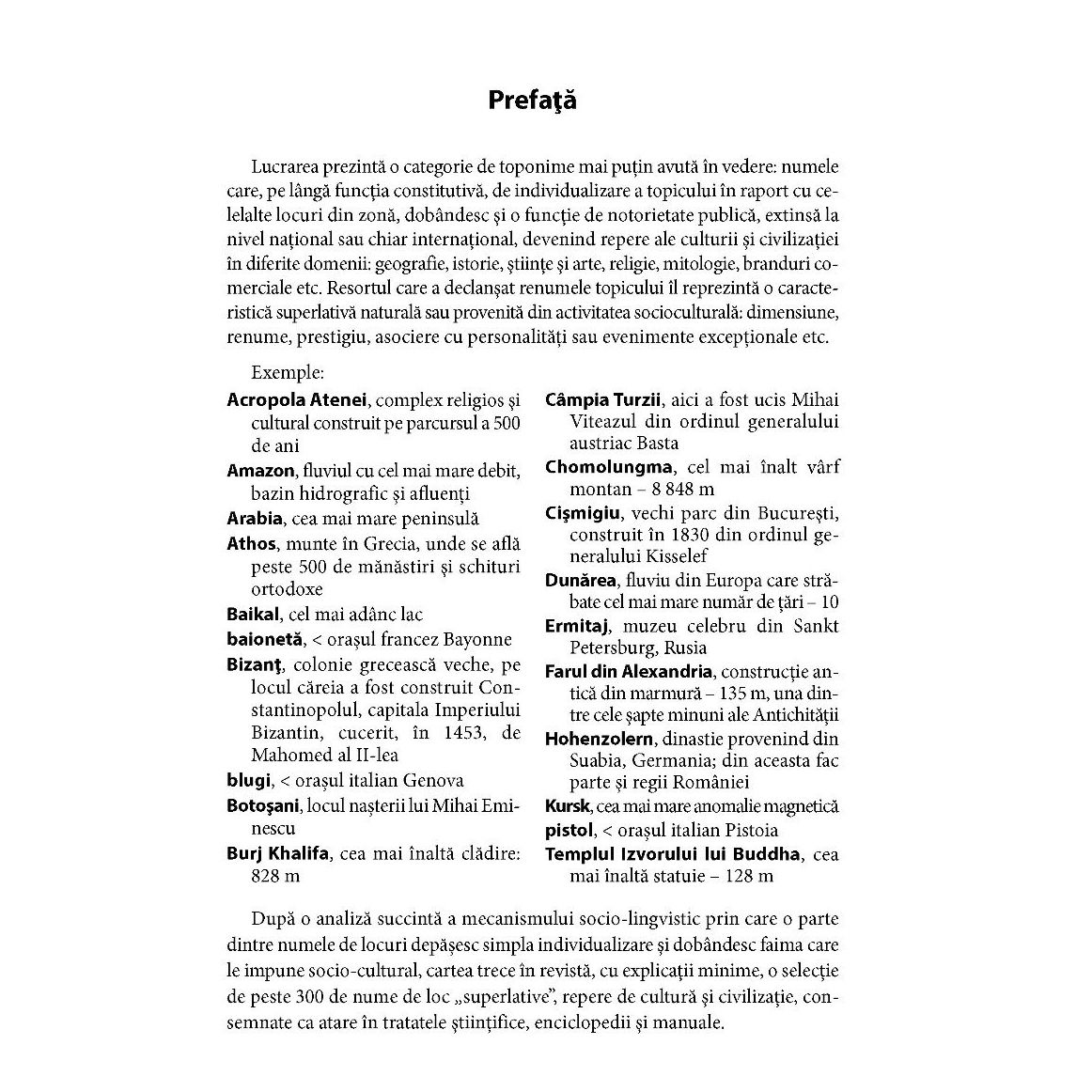 Lucrarea de fata isi propune sa extinda si sa aprofundeze studiul numelor de locuri, o categorie lexicala mai putin avuta in vedere de lingvisti. Disciplina care se ocupa de cercetarea numelor de locuri, toponimia, parte a onomasticii (lingvistica numelor proprii), este o ramura mai noua a lingvisticii si se afla situata la granita cu alte stiinte, in primul rand cu geografia, istoria si sociologia. Poate si de aceea, unele aspecte ale nasterii, evolutiei si functionarii numelor de locuri nu au fost observate si luate in studiu mai devreme.