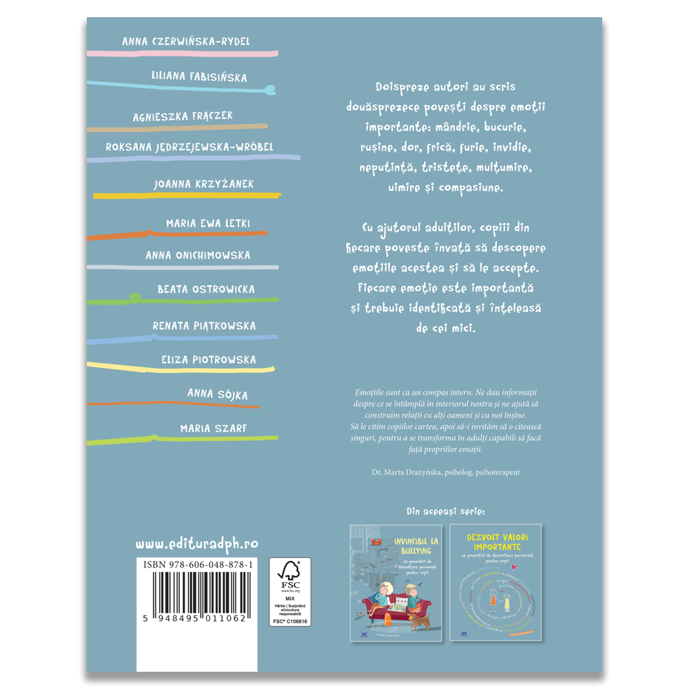 Această carte reunește 12 povești scrise de 12 autori polonezi contemporani, fiecare poveste fiind dedicată unei emoții fundamentale: mândrie, bucurie, rușine, dor, frică, furie, invidie, neputință, tristețe, mulțumire, uimire și compasiune. Cu sprijinul adulților, copiii vor învăța să își identifice emoțiile, să le accepte și să le exprime într-un mod adecvat.