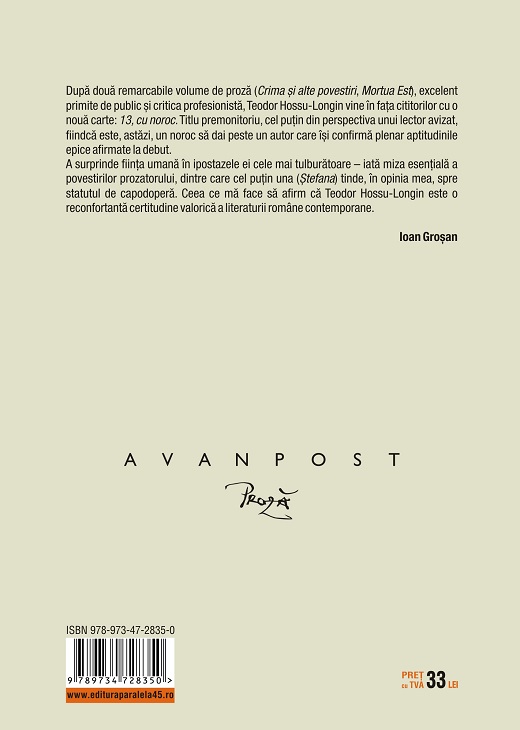 După două remarcabile volume de proză (Crima și alte povestiri, Mortua Est), excelent primite de public și critica profesionistă, Teodor Hossu-Longin vine în fața cititorilor cu o nouă carte: 13, cu noroc. Titlu premonitoriu, cel puțin din perspectiva unui lector avizat, fiindcă este, astăzi, un noroc să dai peste un autor care își confirmă plenar aptitudinile epice afirmate la debut.