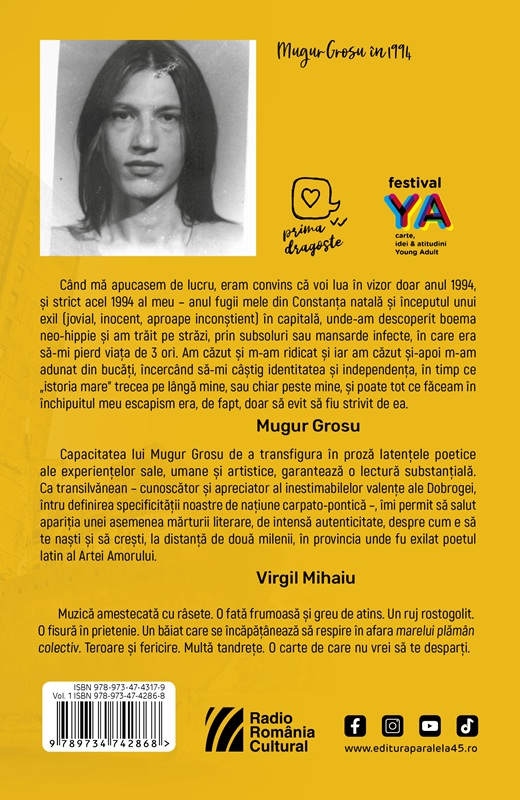 Când mă apucasem de lucru, eram convins că voi lua în vizor doar anul 1994, și strict acel 1994 al meu – anul fugii mele din Constanța natală și începutul unui exil (jovial, inocent, aproape inconștient) în capitală, unde-am descoperit boema neo-hippie și am trăit pe străzi, prin subsoluri sau mansarde infecte, în care era să-mi pierd viața de 3 ori. Am căzut și m-am ridicat și iar am căzut și-apoi m-am adunat din bucăți, încercând să-mi câștig identitatea și independența, în timp ce „istoria mare” trecea pe lângă mine, sau chiar peste mine, și poate tot ce făceam în închipuitul meu escapism era, de fapt, doar să evit să fiu strivit de ea.