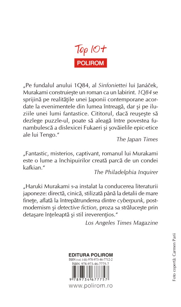 „Pe fundalul anului 1Q84, al Sinfoniettei lui Janáček, Murakami construieşte un roman ca un labirint. 1Q84 se sprijină pe realităţile unei Japonii contemporane acordate la evenimentele din lumea întreagă, dar şi pe iluziile unei lumi fantastice. Cititorul, dacă reuşeşte să dezlege puzzle-ul, poate să aleagă între povestea funambulescă a dislexicei Fukaeri şi şovăielile epic-etice ale lui Tengo.” (The Japan Times)