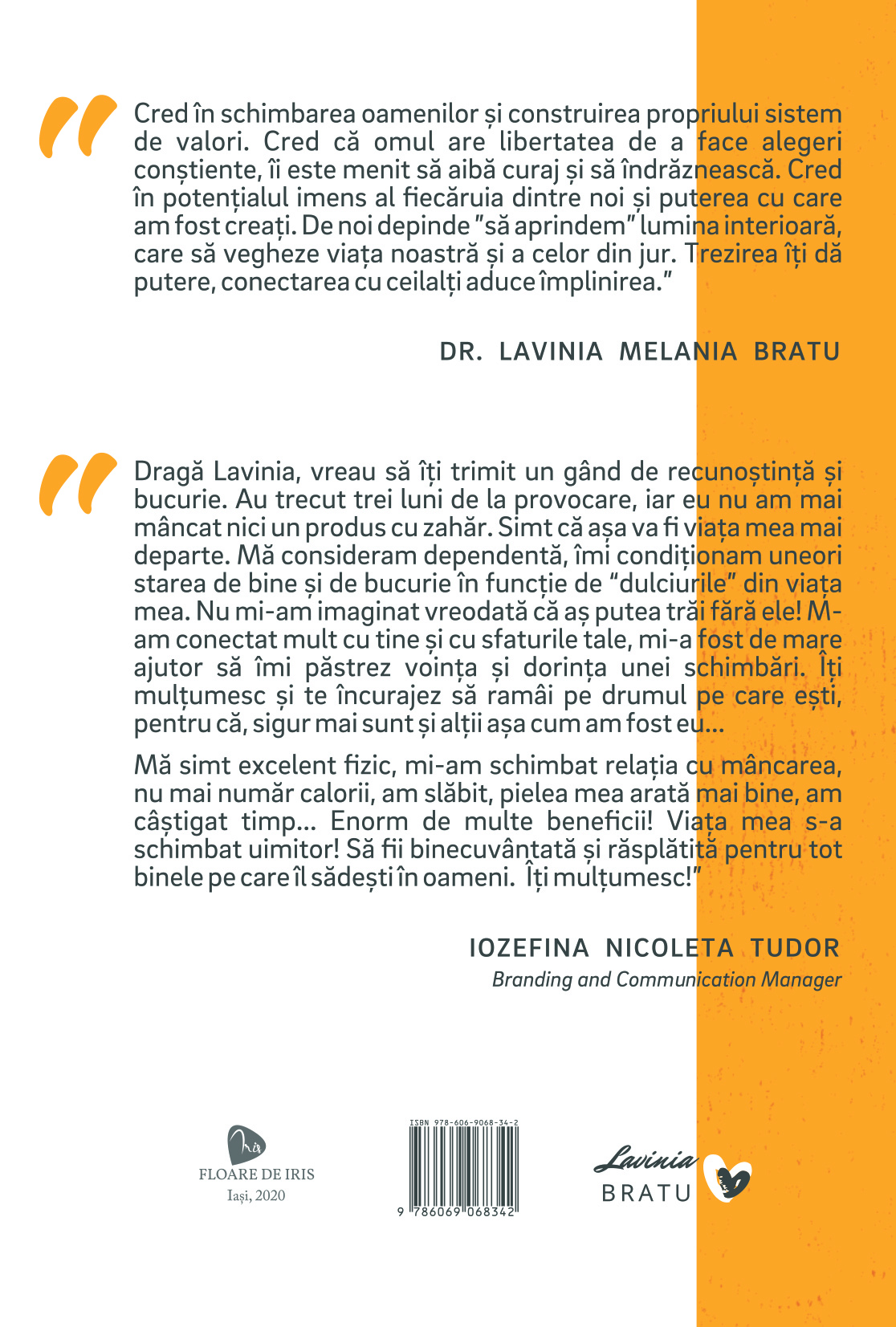 Dr. Biolog Lavinia Melania Bratu oferă publicului o lucrare valoroasă, în care rețetele fără zahăr se îmbină armonios cu recomandări utile și practice și cu impresii ale celor care au trecut deja prin programul „30 de zile fără zahăr”. Este o carte scrisă alături de alte zeci de persoane, toate răspunzând aceleeași provocări: #30DaysNoSugar.