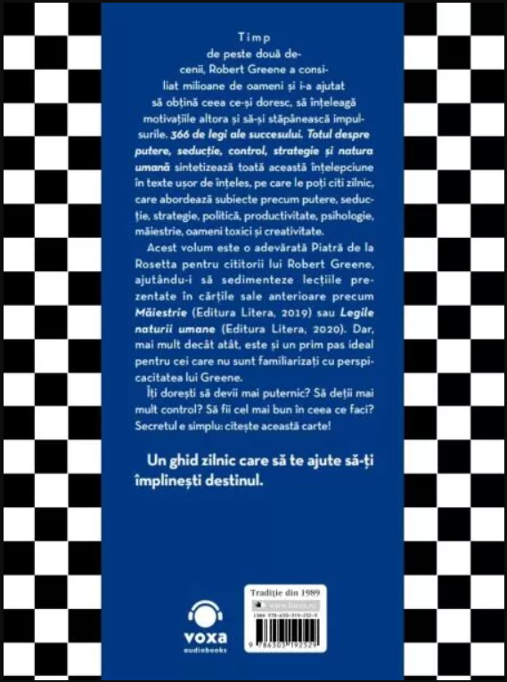 Timp de peste două decenii, Robert Greene a consiliat milioane de oameni și i-a ajutat să obțină ceea ce-și doresc, să înțeleagă motivațiile altora și să-și stăpânească impulsurile. 366 de legi ale succesului. Totul despre putere, seducție, control, strategie și natura umană sintetizează toată această înțelepciune în texte ușor de înțeles, pe care le poți citi zilnic, care abordează subiecte precum putere, seducție, strategie, politică, productivitate, psihologie, măiestrie, oameni toxici și creativitate.