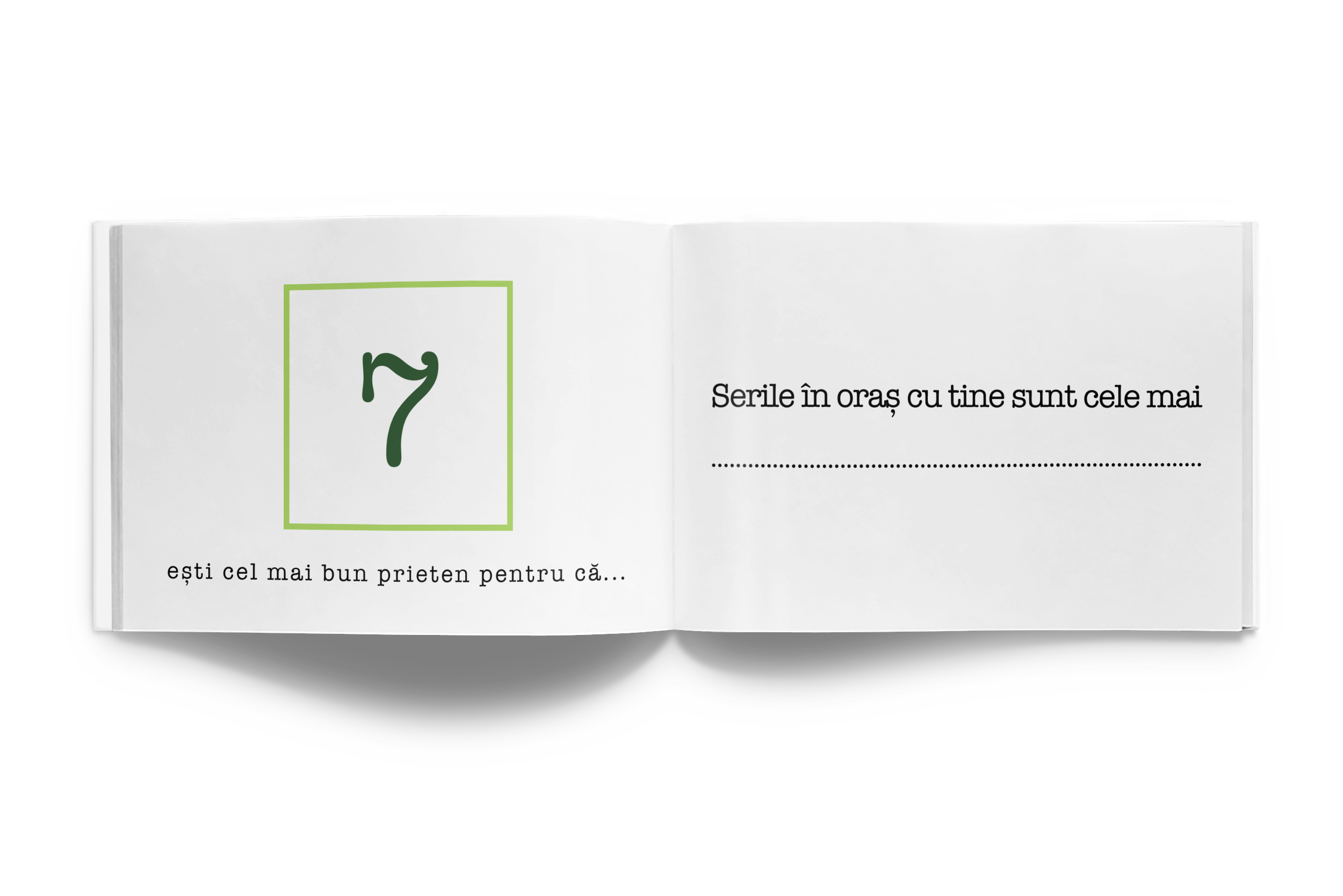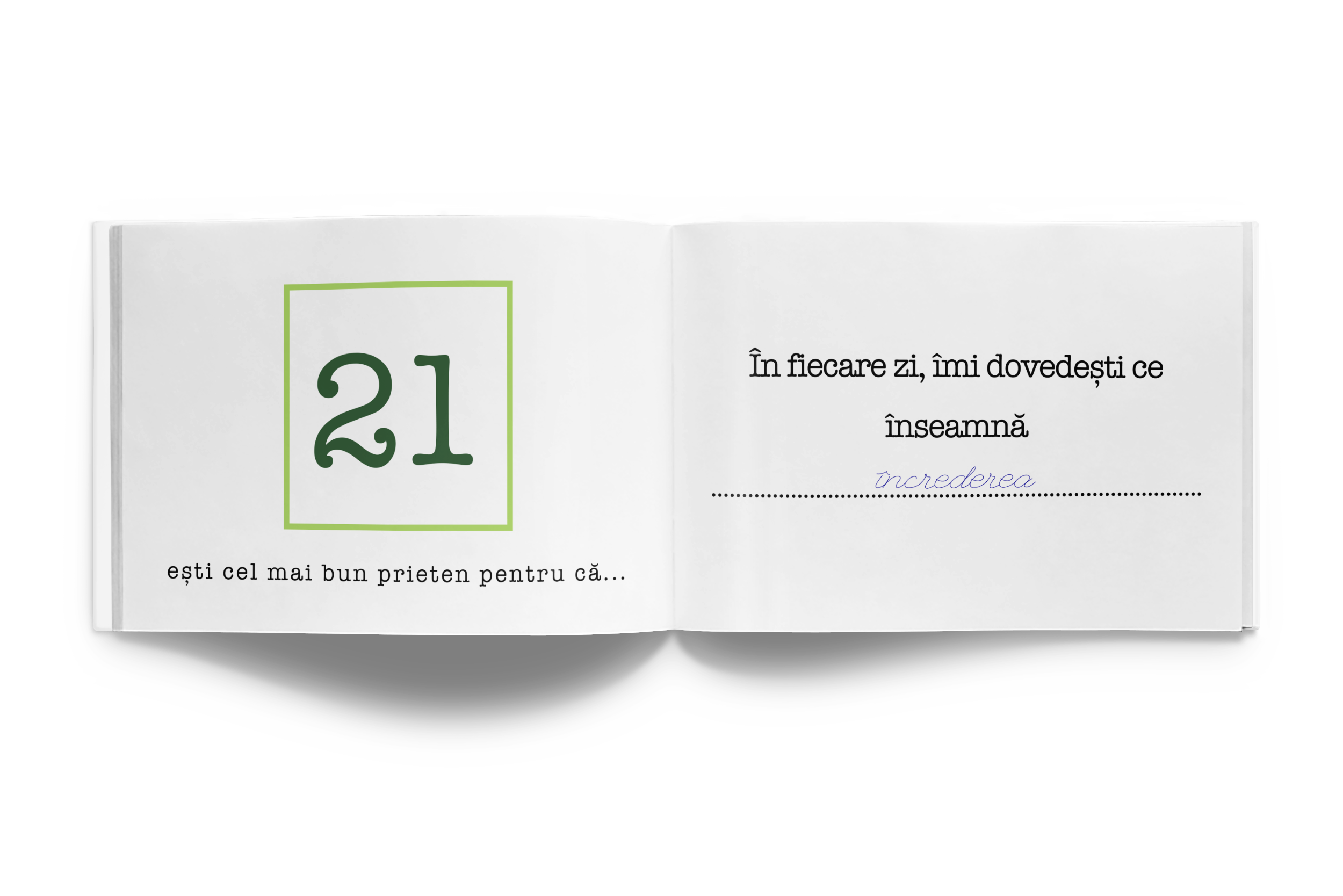 Un prieten adevarat este o descoperire rară, dar dacă ești aici înseamnă că ai suficient noroc încât să ai unul. Chiar dacă vă leagă o mulțime de amintiri și sentimente, câteodată este dificil să îți găsești cuvintele potrivite pentru ai spune ce simți pentru el. Tocmai pentru că știm ce înseamnă asta, am creat cartea 50 de motive pentru care ești - Cel mai bun prieten. Simplele sugestii te vor ajuta să îți exprimi mai ușor cuvintele potrivite. Poți să o completezi într-o manieră amuzantă, copilăroasă sau sentimentală. Tu alegi!