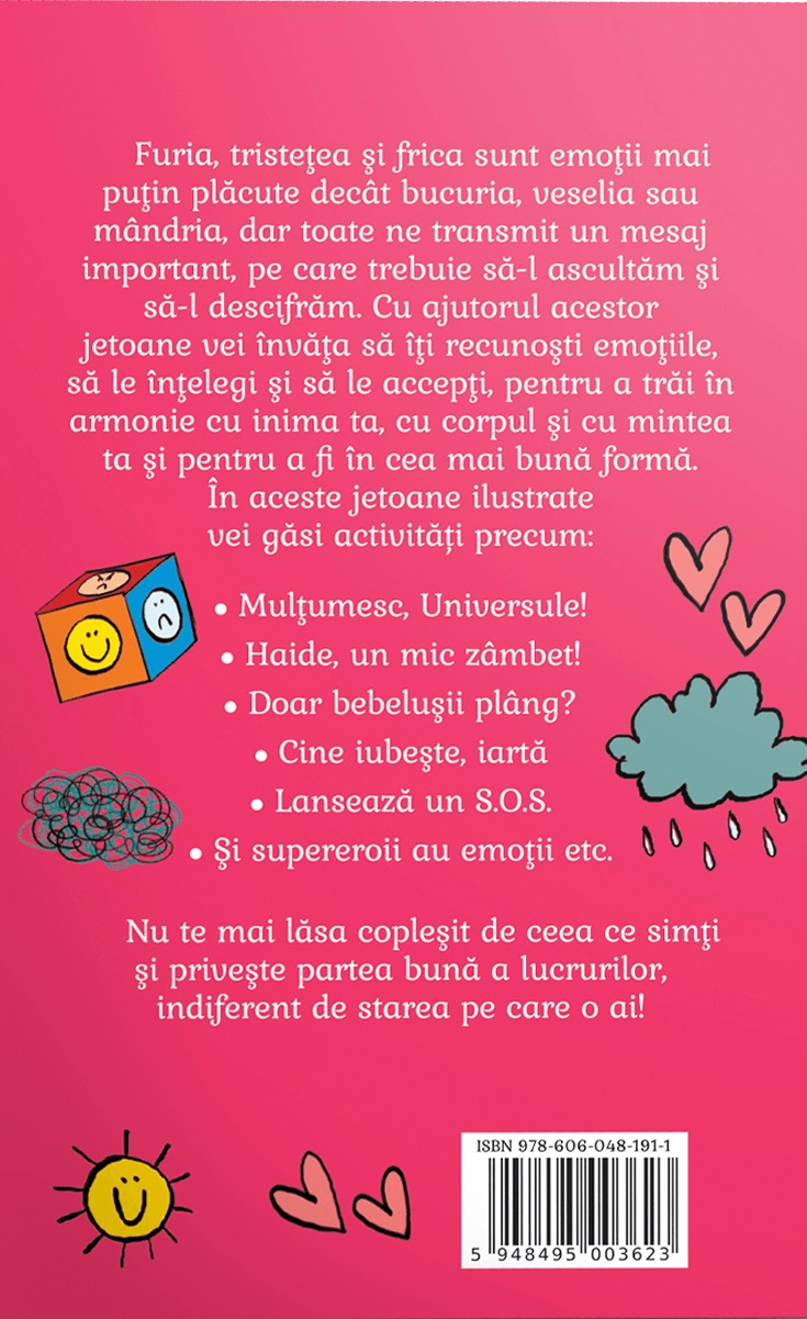 Furia, tristețea și frica sunt emoții mai puțin plăcute decât bucuria, veselia sau mândria, dar toate ne transmit un mesaj important, pe care trebuie să-l ascultăm și să-l descifrăm. Cu ajutorul acestor jetoane vei învăța să îți recunoști emoțiile, să le înțelegi și să le accepți, pentru a trăi în armonie cu inima ta, cu corpul și cu mintea ta și pentru a fi în cea mai bună formă.