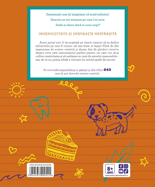Acest jurnal unic îi încurajează pe tinerii creatori să se dedice subiectului pe care îl cunosc cel mai bine: ei înșiși! Plină de idei ingenioase de scriere creativă și desen, 642 de gânduri creative despre mine este instrumentul perfect pentru cei care vor să-și cultive creativitatea și să realizeze un caiet de amintiri memorabile – sau, de ce nu, prima schiţă a viitoarei lor autobiografii de succes!