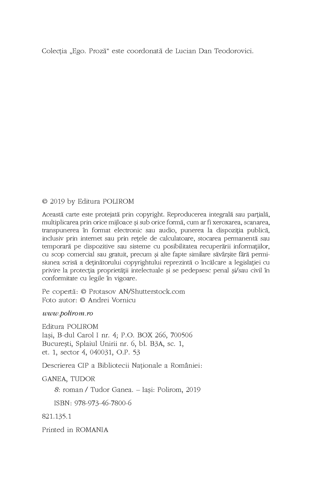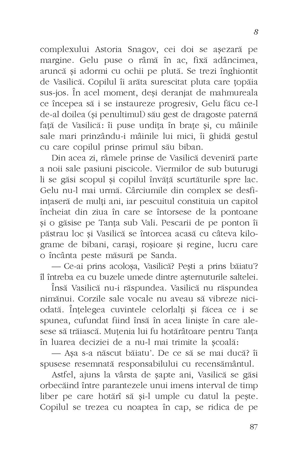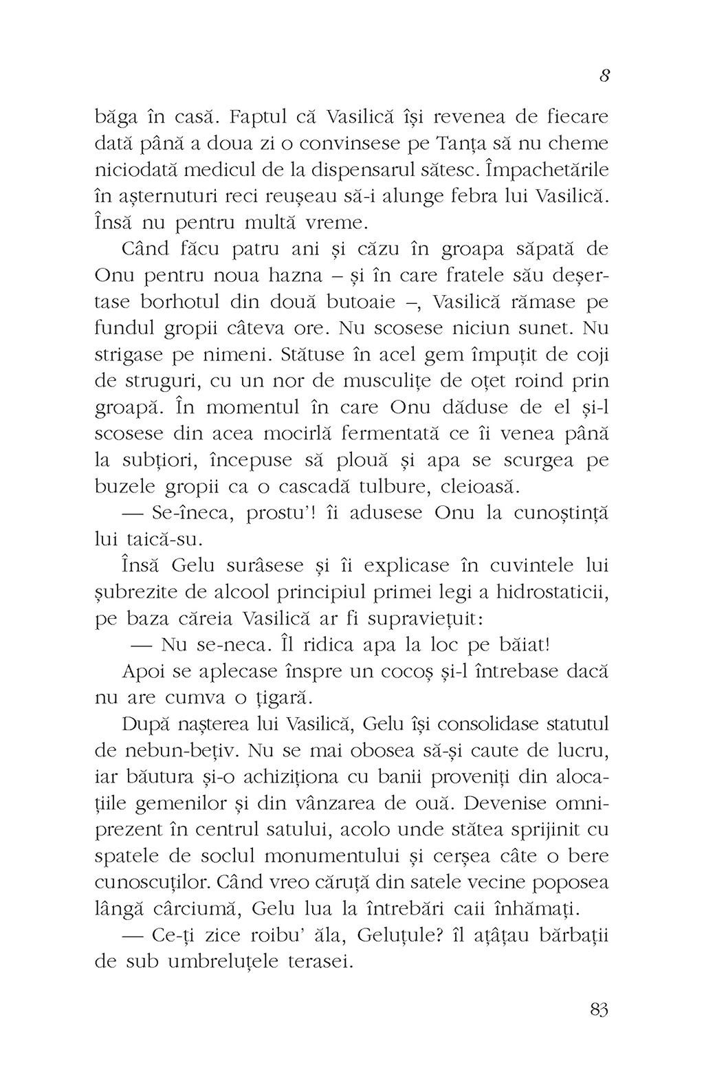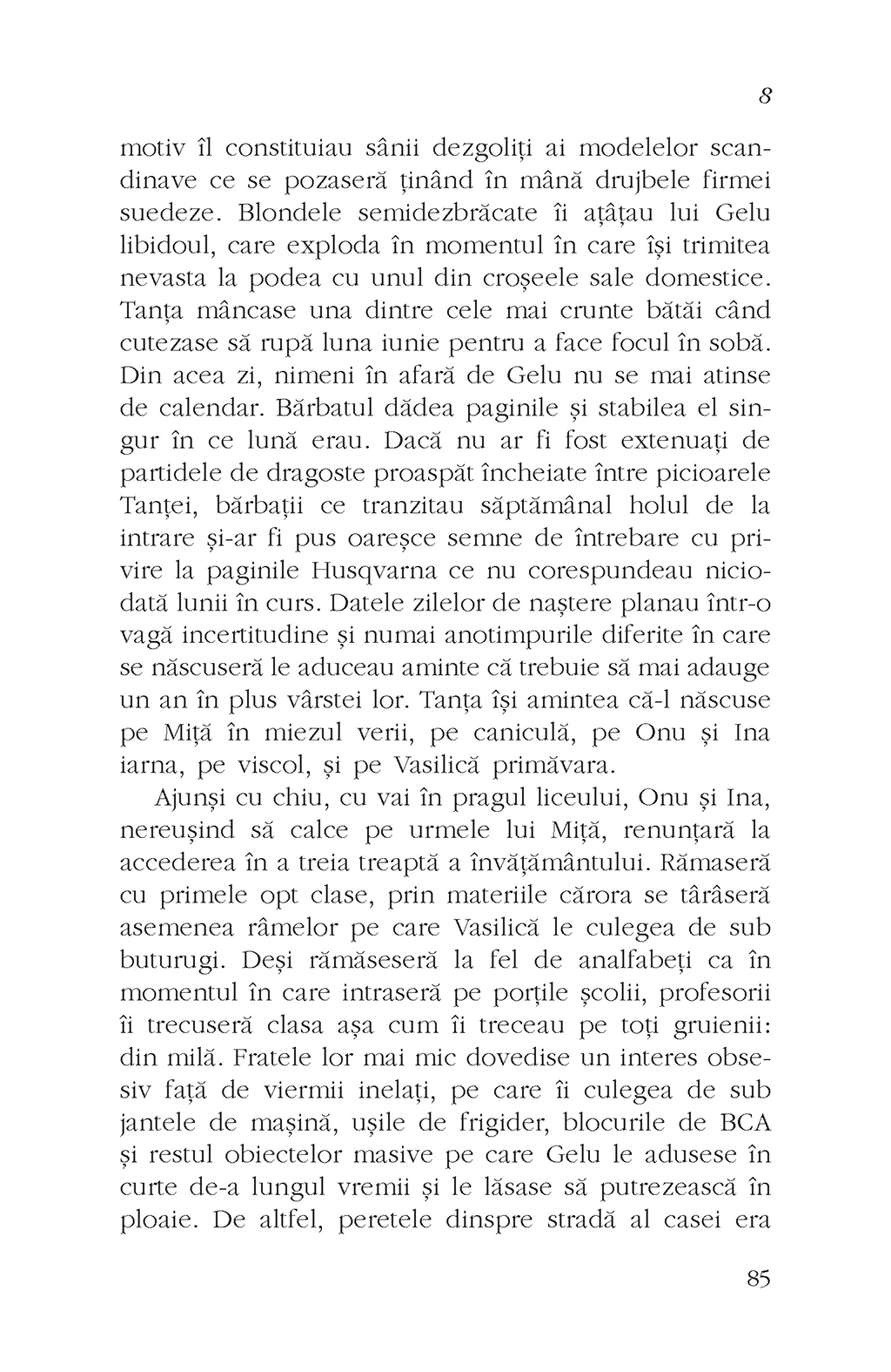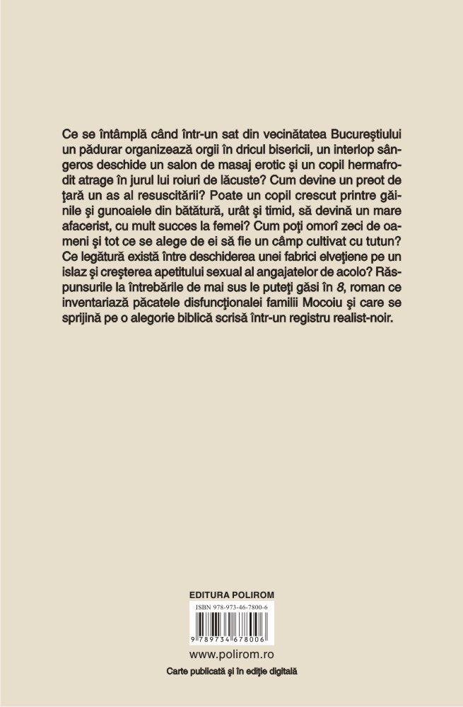 Ce se întîmplă cînd într-un sat din vecinătatea Bucureştiului un pădurar organizează orgii în dricul bisericii, un interlop sîngeros deschide un salon de masaj erotic şi un copil hermafrodit atrage în jurul lui roiuri de lăcuste? Cum devine un preot de ţară un as al resuscitării? Poate un copil crescut printre găinile şi gunoaiele din bătătură, urît şi timid, să devină un mare afacerist, cu mult succes la femei? Cum poţi omorî zeci de oameni şi tot ce se alege de ei să fie un cîmp cultivat cu tutun? Ce legătură există între deschiderea unei fabrici elveţiene pe un islaz şi creşterea apetitului sexual al angajatelor de acolo? Răspunsurile la întrebările de mai sus le puteţi găsi în 8, roman ce inventariază păcatele disfuncţionalei familii Mocoiu şi care se sprijină pe o alegorie biblică scrisă într-un registru realist-noir.