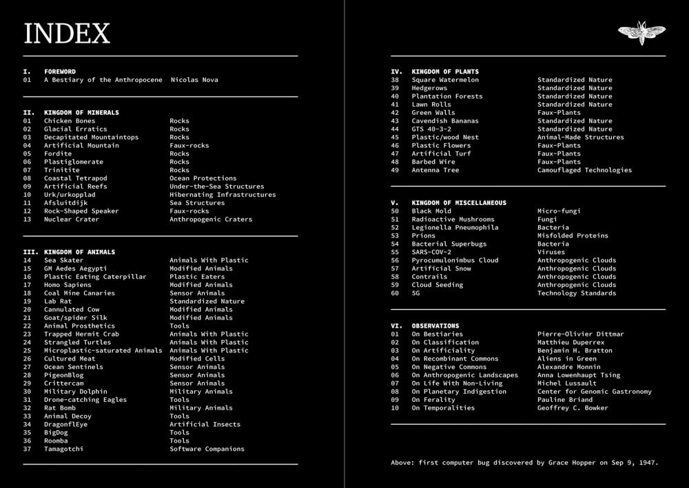 A sort of field handbook, A Bestiary of the Anthropocene aims to help us orient ourselves within the technosphere and the biosphere. What happens when technologies and their unintended consequences become so ubiquitous that it is difficult to define what is "natural" or not? What does it mean to live in a hybrid environment made of organic and synthetic matter? In order to answer such questions, Nova and DISNOVATION.ORG bring their own research together with contributions from collectives such as the Center for Genomic Gastronomy and Aliens in Green as well as text by scholars and researchers from around the world. Polish graphic designer Maria Roszkowska provides illustrations.