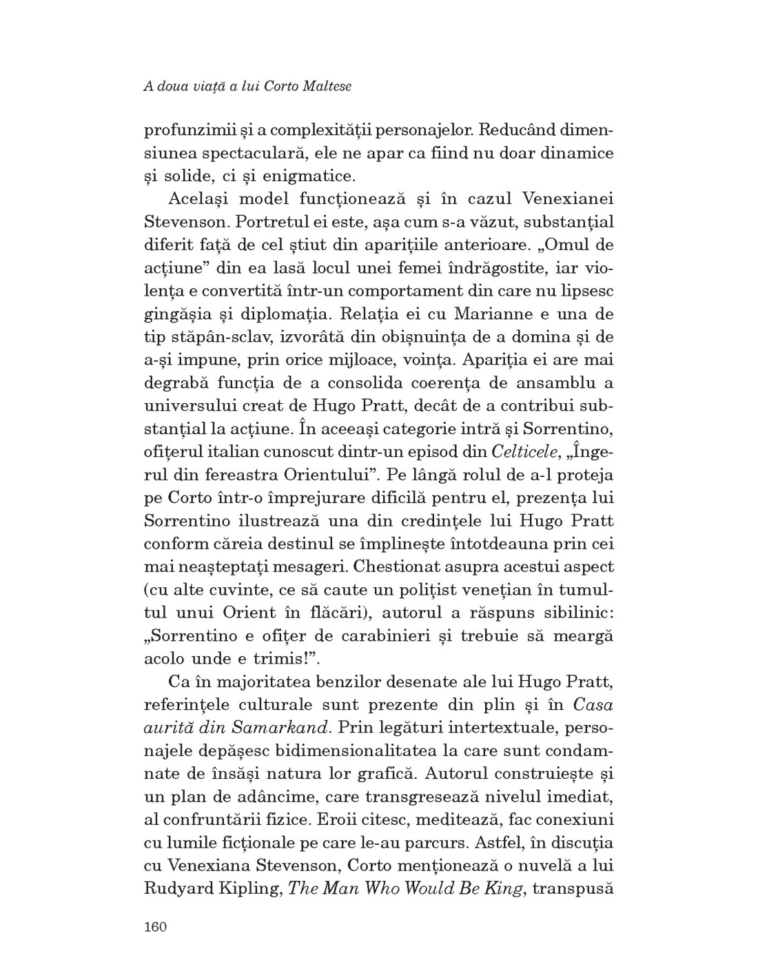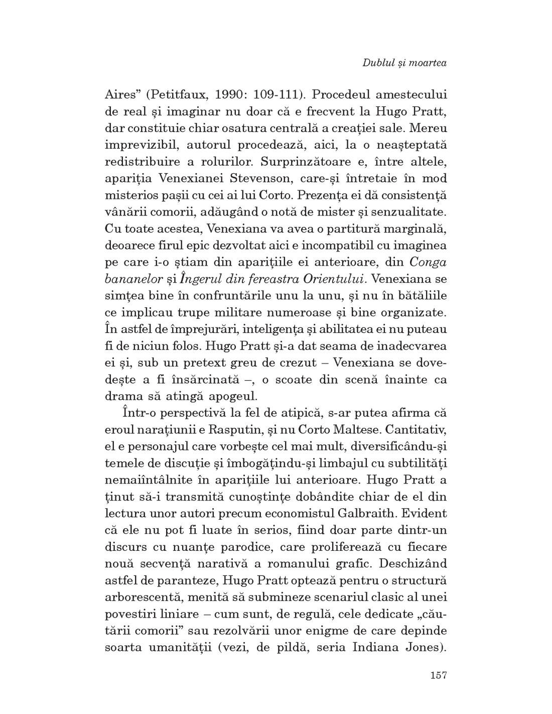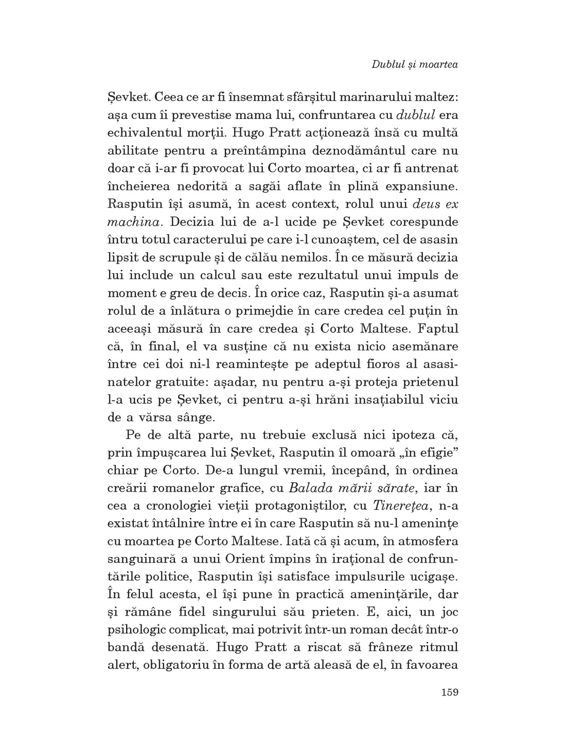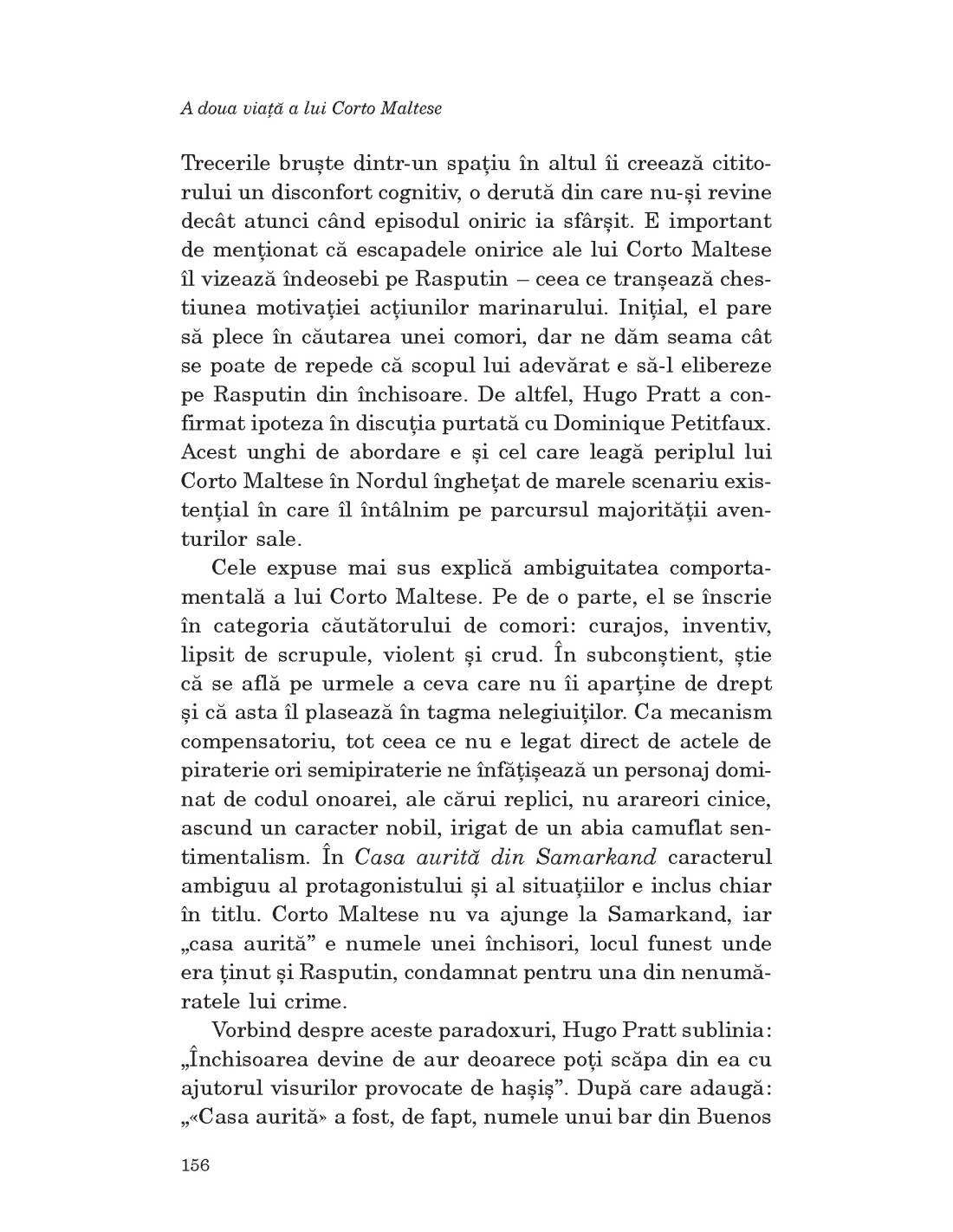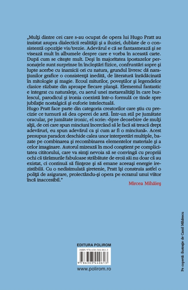 „Mulți dintre cei care s-au ocupat de opera lui Hugo Pratt au insistat asupra dialecticii realității și a iluziei, dublate de o consistentă opoziție vis/trezie. Adevărul e că se fantasmează și se visează mult în albumele despre care e vorba în această carte. După cum se citește mult. Deși în majoritatea ipostazelor personajele sunt surprinse în încleștări fizice, confruntări aspre și lupte acerbe cu inamicii ori cu natura, grundul livresc dă narațiunilor grafice o consistență inedită, de literatură înrădăcinată în mitologie și magie. Ecoul miturilor, poveștilor și legendelor clasice răzbate din aproape fiecare planșă. Elementul fantastic e integrat cu naturalețe, cu aerul unei metarealități în care burlescul, parodicul și ironia coexistă într-o formulă ce tinde spre jubilație nostalgică și euforie intelectuală.