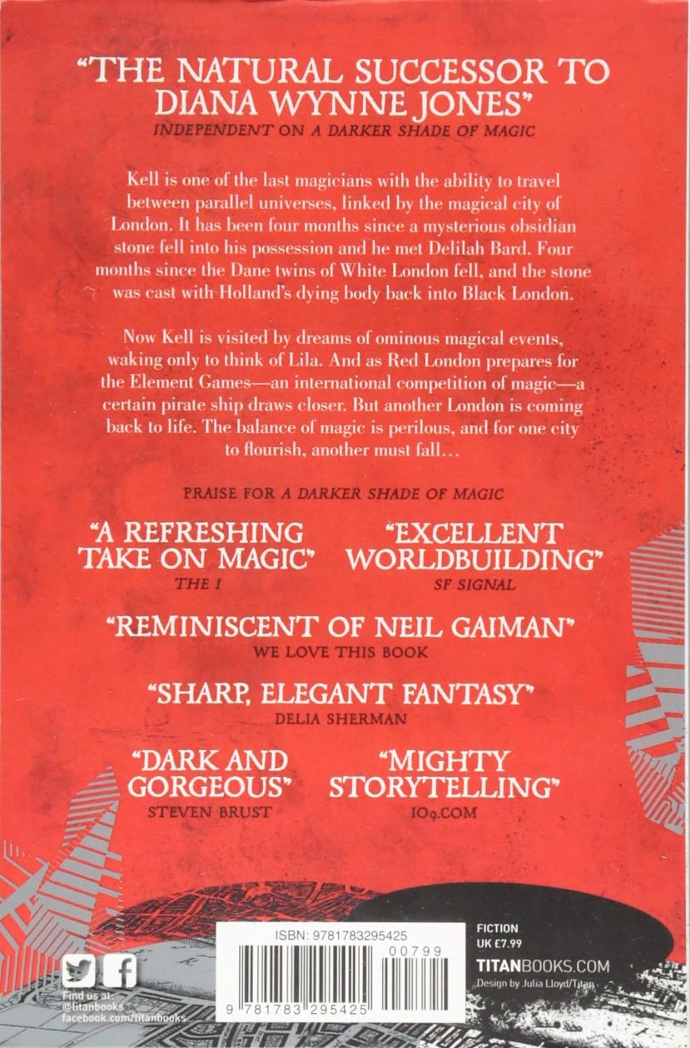 Kell is one of the last magicians with the ability to travel between parallel universes, linked by the magical city of London. It has been four months since a mysterious obsidian stone fell into his possession and he met Delilah Bard. Four months since the Dane twins of White London fell, and the stone was cast with Holland's dying body back into Black London. Now Kell is visited by dreams of ominous magical events, waking only to think of Lila. And as Red London prepares for the Element Games an international competition of magic a certain pirate ship draws closer. But another London is coming back to life. The balance of magic is perilous, and for one city to flourish, another must fall...