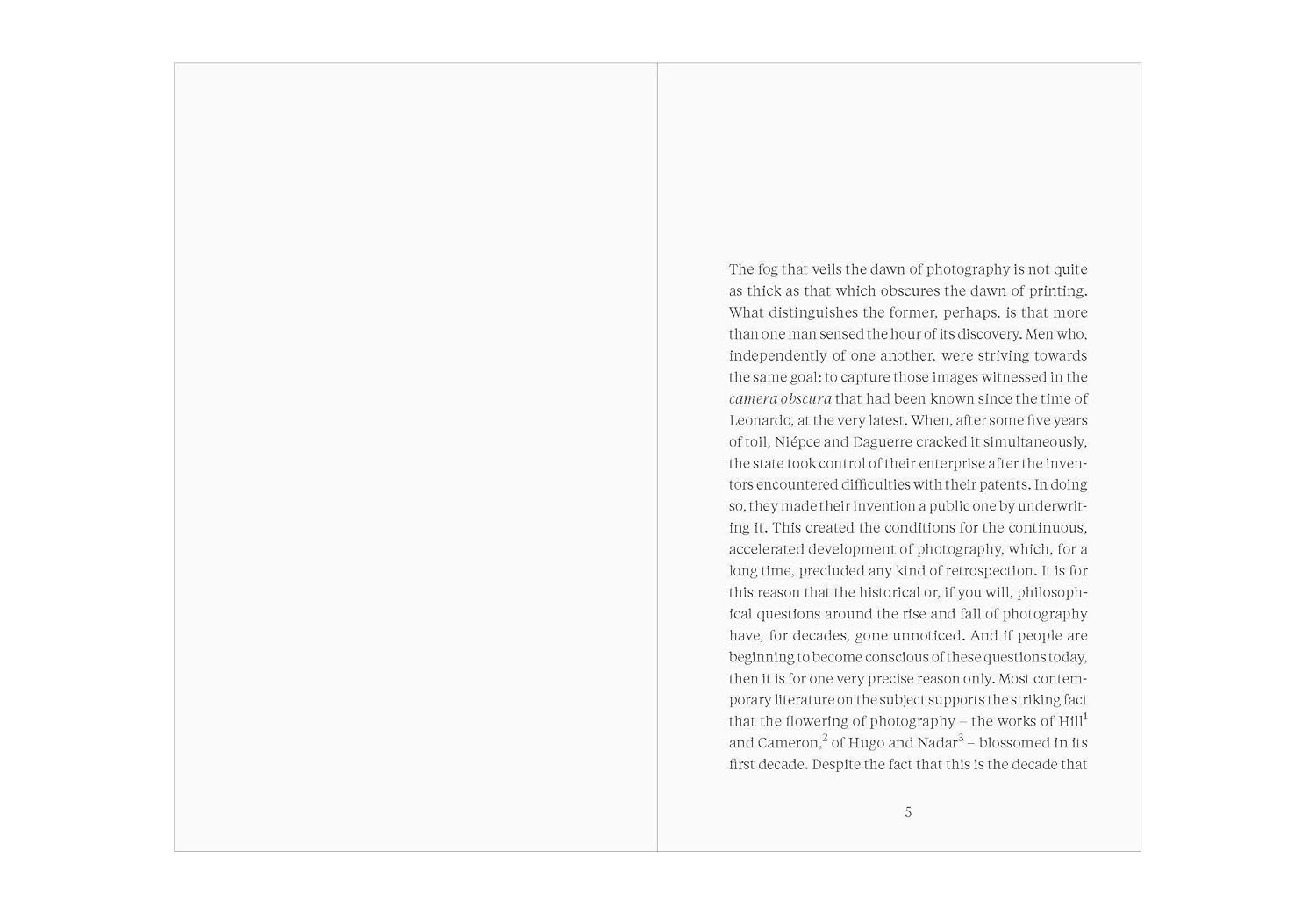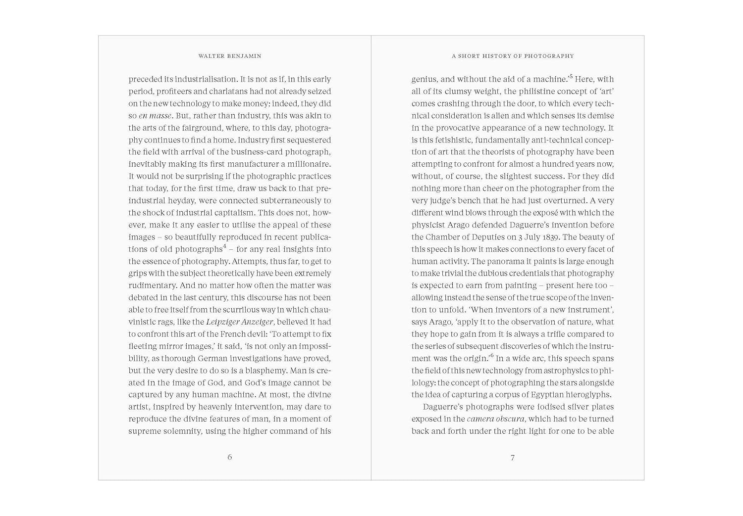 A Little History of Photography was originally published in the German literary journal Die Literarische Welt in 1931 as three short essays reviewing several books dedicated to early photography. In this text, Benjamin introduced concepts that remain central to critical theory of the medium: the aura, optical unconscious, reproducibility, among other topics. It constitutes a remarkably prescient description of the limits and potentials of photography which remains thought-provoking today.