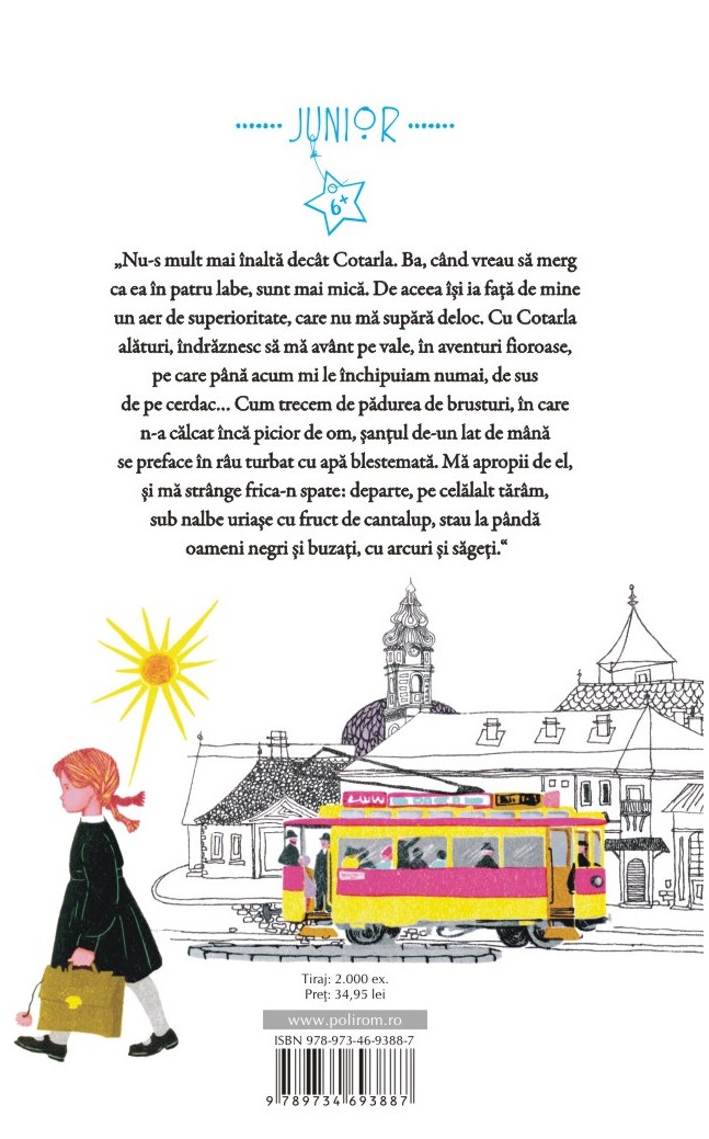 Nu‑s mult mai înaltă decât Cotarla. Ba, când vreau să merg ca ea în patru labe, sunt mai mică. De aceea își ia faţă de mine un aer de superioritate, care nu mă supără deloc. Cu Cotarla alături, îndrăznesc să mă avânt pe vale, în aventuri fioroase, pe care până acum mi le închipuiam numai, de sus de pe cerdac… Cum trecem de pădurea de brusturi, în care n‑a călcat încă picior de om, șanţul de‑un lat de mână se preface în râu turbat cu apă blestemată. Mă apropii de el, și mă strânge frica‑n spate: departe, pe celălalt tărâm, sub nalbe uriașe cu fruct de cantalup, stau la pândă oameni negri și buzaţi, cu arcuri și săgeţi.