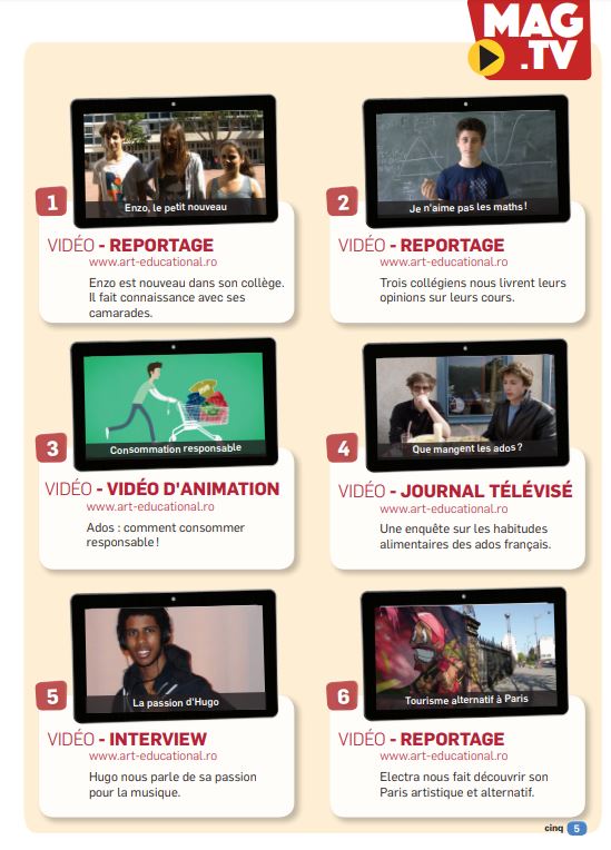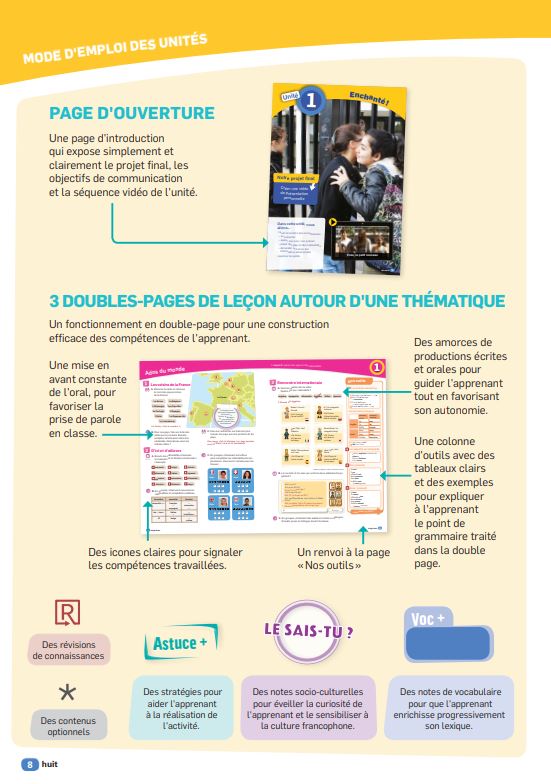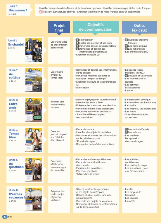• 6 unités qui comptent chacune 3 leçons et un grand nombre d'outils linguistiques pour préparer l’apprenant à la réalisation des projets finaux une sensibilisation à l’univers des adolescents francophones dans les pages Mag.com avec des thématiques culturelles originales et une vidéo par unité, accompagnée de son exploitation pédagogique