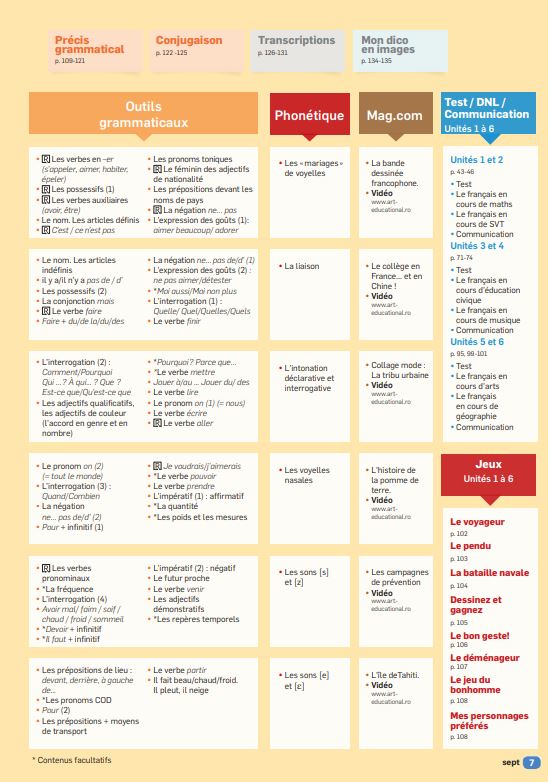- introducerea de noi conţinuturi, cerute de programa românească: tematice/lexicale [stări sufleteşti, profesii, mobilier, aparate electrocasnice, conversaţii telefonice), gramaticale [adjective demonstrative, verbe: finir, écrire, partir; avoir faim/soif ...), jocuri [Jeu du bonhomme) şi terne de proiect (Mes personnages préférés ).