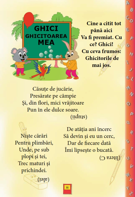 Pe lânga faptul ca dezvoltă imaginaţia copiilor, poeziile din aceasta carte sunt şi distractive. Volumul cuprinde poezii despre toate literele alfabetului, prezentate într-un mod amuzant, dar şi o colecţie de ghicitori care vor stârni curiozitatea copilului dumneavoastră.