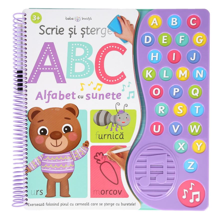 Conține 26 de sunete și o melodie pe care poți cânta alfabetul.