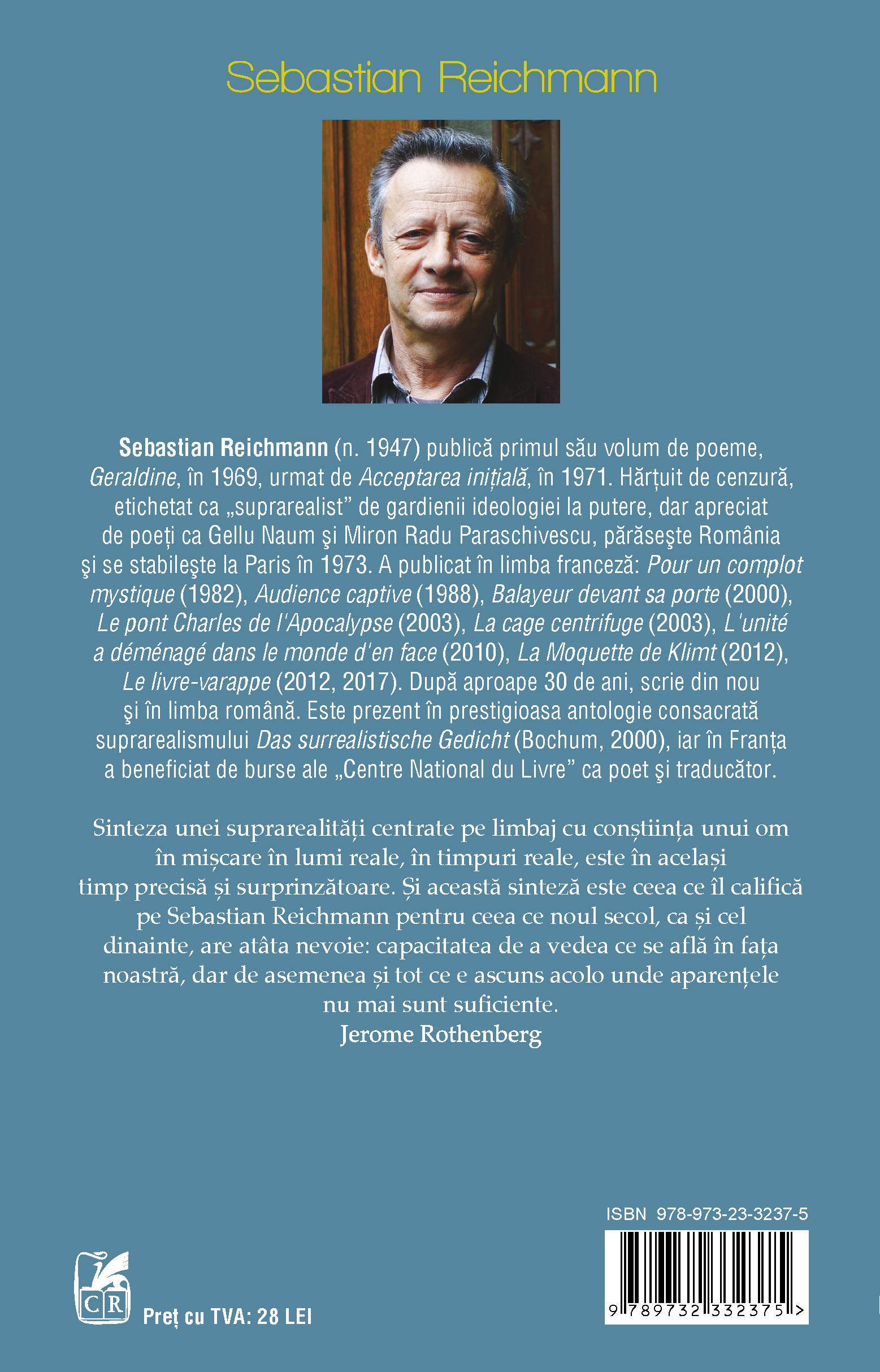 Sebastian Reichmann (n. 1947) publică primul său volum de poeme, Geraldine, în 1969, urmat de Acceptarea iniţială, în 1971. Hărţuit de cenzură, etichetat ca „suprarealist” de gardienii ideologiei la putere, dar apreciat de poeţi ca Gellu Naum şi Miron Radu Paraschivescu, părăseşte România şi se stabileşte la Paris în 1973. A publicat în limba franceză: Pour un complot mystique (1982), Audience captive (1988), Balayeur devant sa porte (2000), Le pont Charles de l’Apocalypse (2003), La cage centrifuge (2003), L’unité a déménagé dans le monde d’en face (2010), La Moquette de Klimt (2012), Le livre-varappe (2012, 2017). După aproape 30 de ani, scrie din nou şi în limba română. Este prezent în prestigioasa antologie consacrată suprarealismului Das surrealistische Gedicht (Bochum, 2000), iar în Franţa a beneficiat de burse ale „Centre National du Livre” ca poet şi traducător.