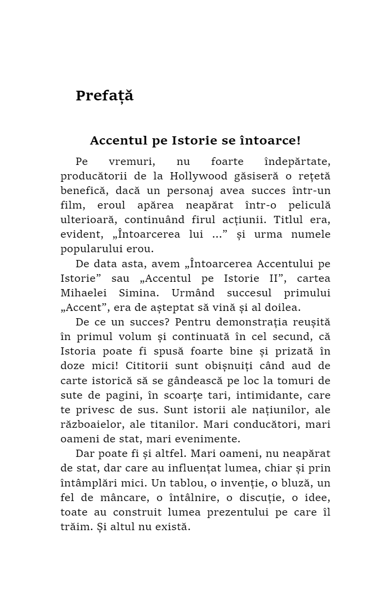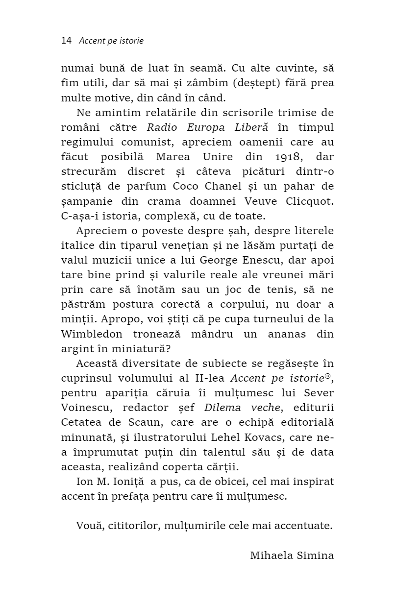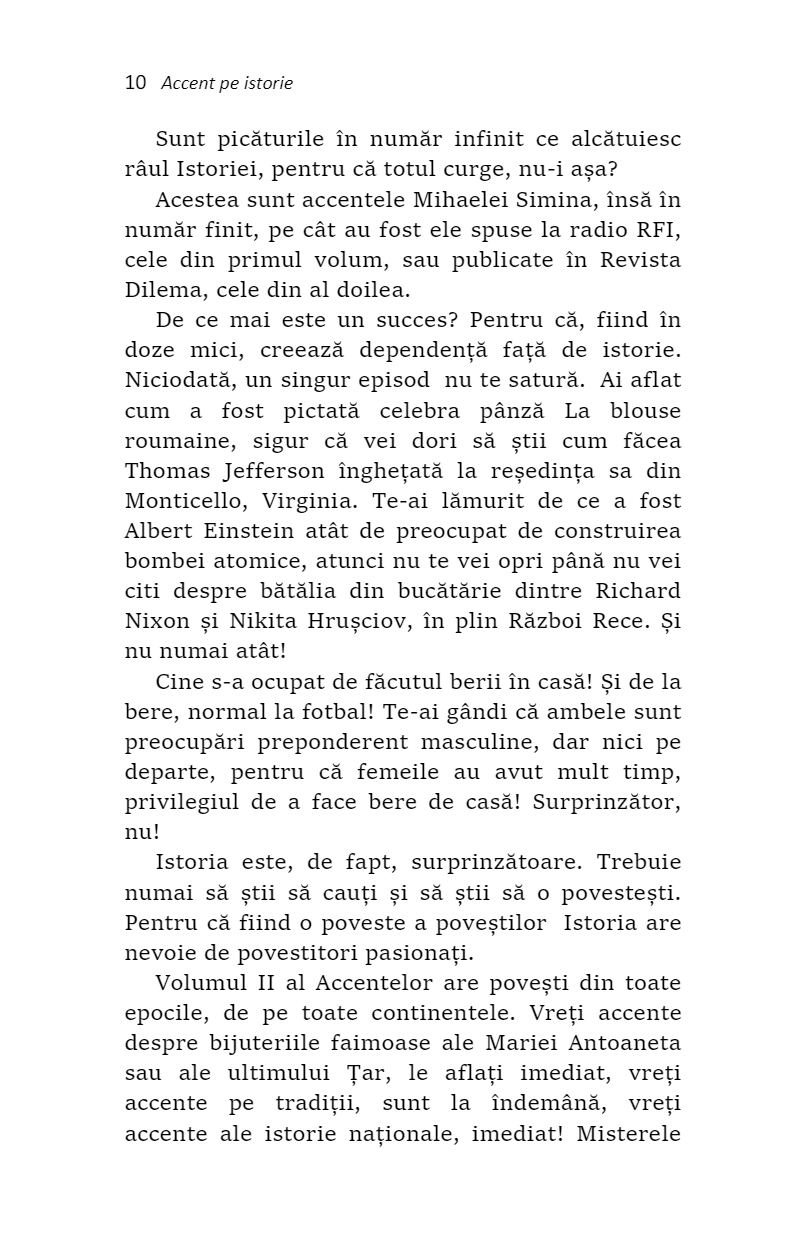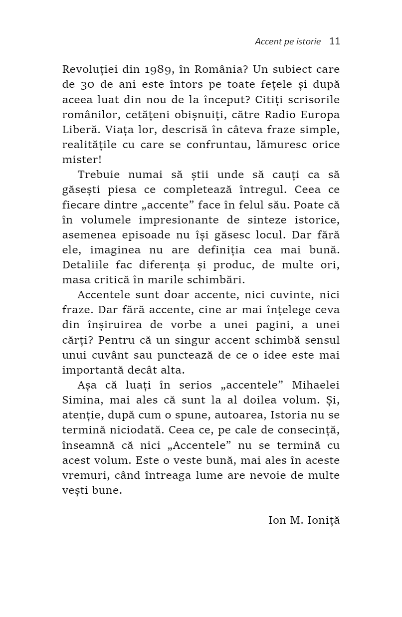 Volumul II al Accentelor are povești din toate epocile, de pe toate continentele. Vreți accente despre bijuteriile faimoase ale Mariei Antoaneta sau ale ultimului Țar, le aflați imediat, vreți accente pe tradiții, sunt la îndemână, vreți accente ale istorie naționale, imediat! Misterele Revoluției din 1989, în România? Un subiect care de 30 de ani este întors pe toate fețele și după aceea luat din nou de la început? Citiți scrisorile românilor, cetățeni obișnuiți, către Radio Europa Liberă. Viața lor, descrisă în câteva fraze simple, realitățile cu care se confruntau, lămuresc orice mister! Așa că luați în serios „accentele” Mihaelei Simina, mai ales că sunt la al doilea volum. Și, atenție, după cum o spune, autoarea, Istoria nu se termină niciodată. Ceea ce, pe cale de consecință, înseamnă că nici „Accentele” nu se termină cu acest volum. Este o veste bună, mai ales în aceste vremuri, când întreaga lume are nevoie de multe vești bune. Ion M. Ioniță