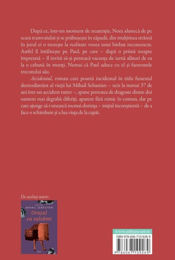 Accidentul, roman care poartă incidental în titlu funestul deznodământ al vieții lui Mihail Sebastian – ucis la numai 37 de ani într-un accident rutier - , spune povestea de dragoste dintre doi oameni mai degrabă diferiți, aparent fără nimic în comun, dar pe care ajunge să-i unească dorința – inițial inconștientă – de a face o schimbare și a lua viața de la capăt.