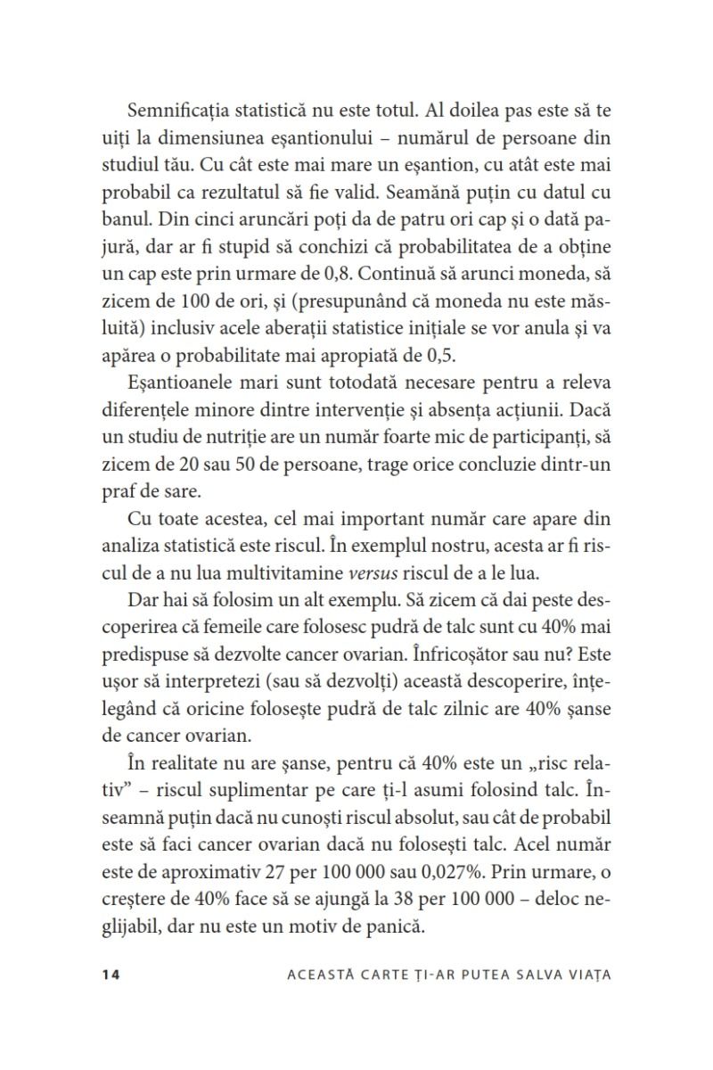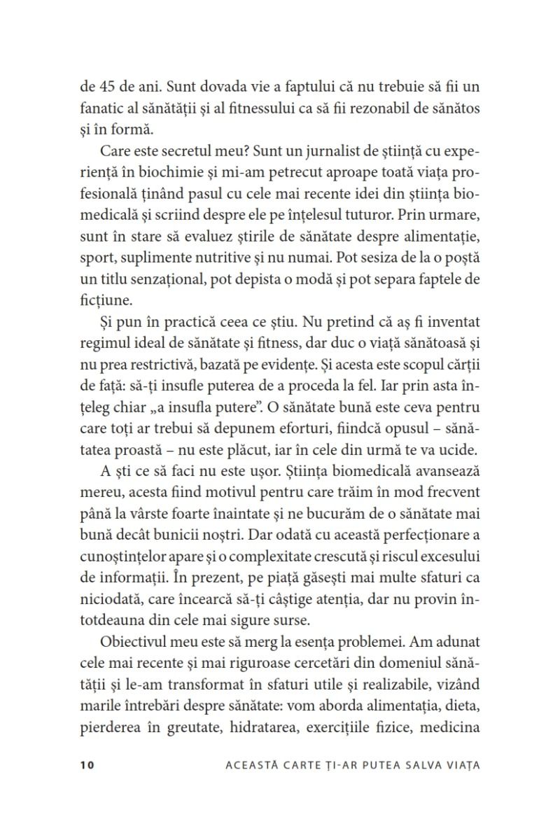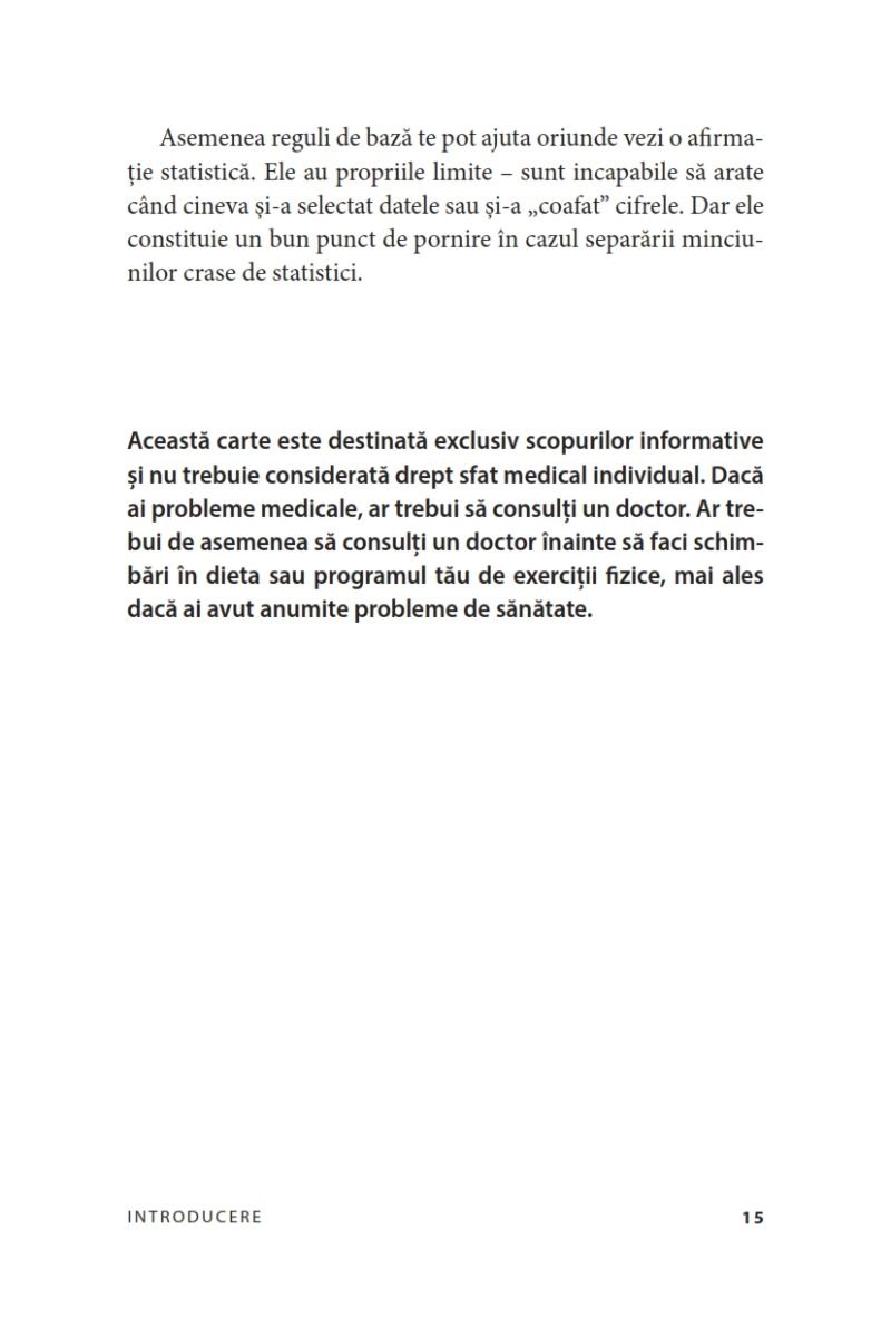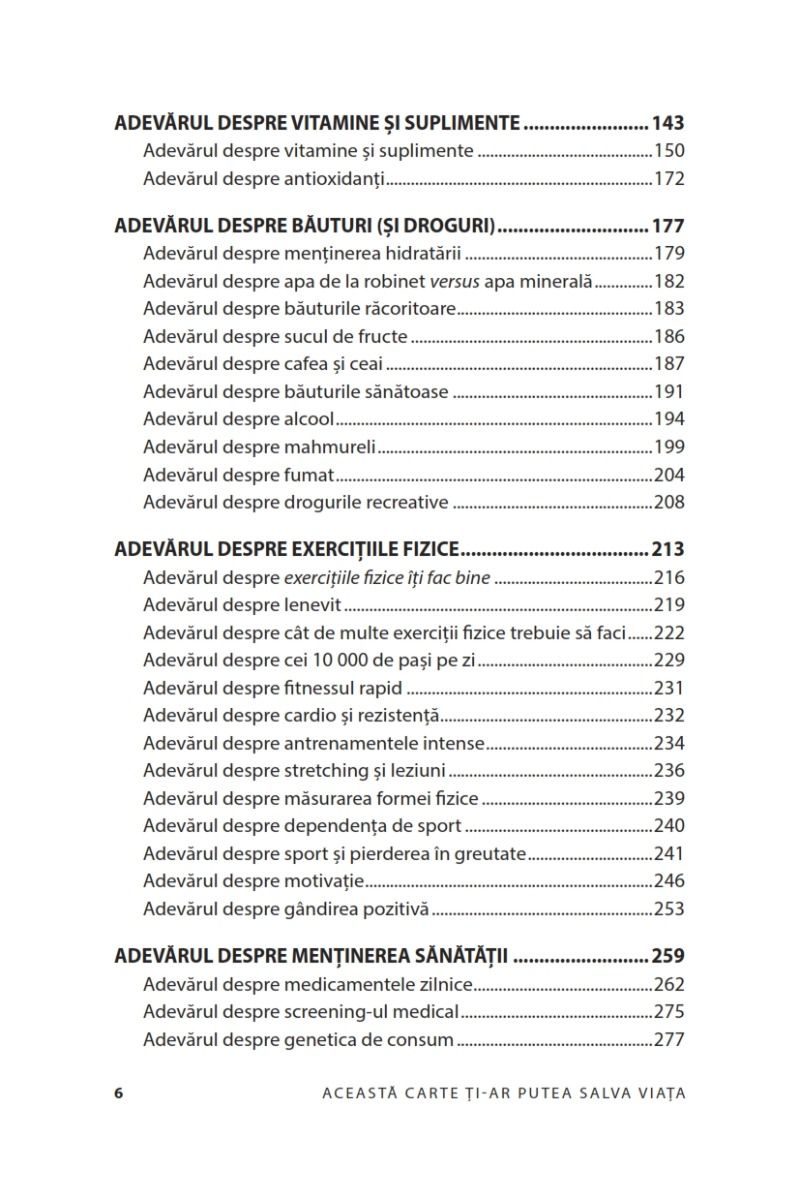 Analizând statistici amețitoare și titluri terifiante, aici vei găsi adevărul despre diete, medicamente, cei 10 000 de pași zilnici, slănină, numărarea caloriilor, cafea, lactate, somn, fibre, mahmu¬reală, sare, zahăr, cardio, protecție solară, statine, vitamine etc.