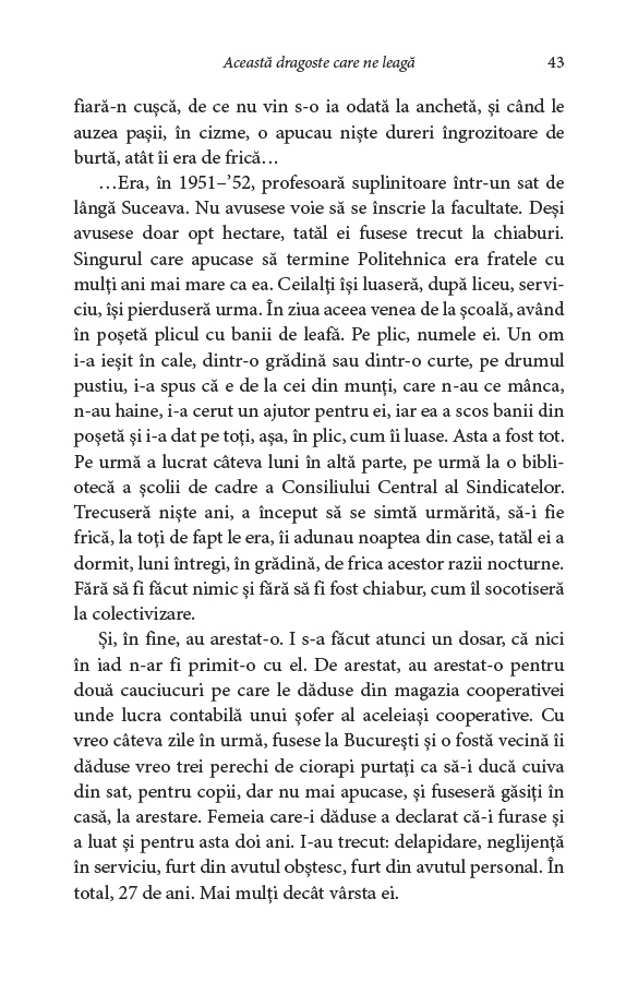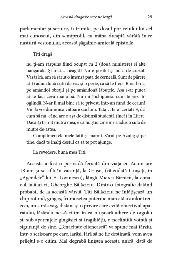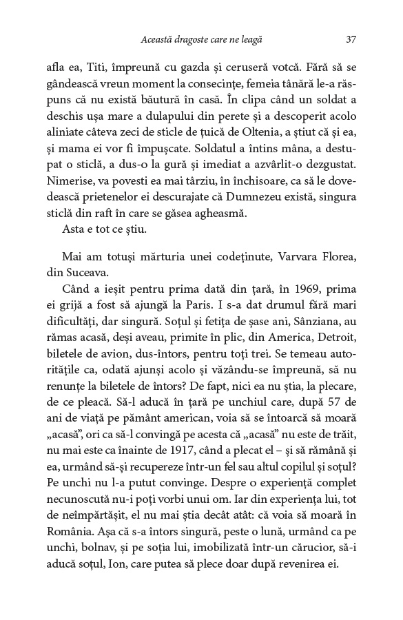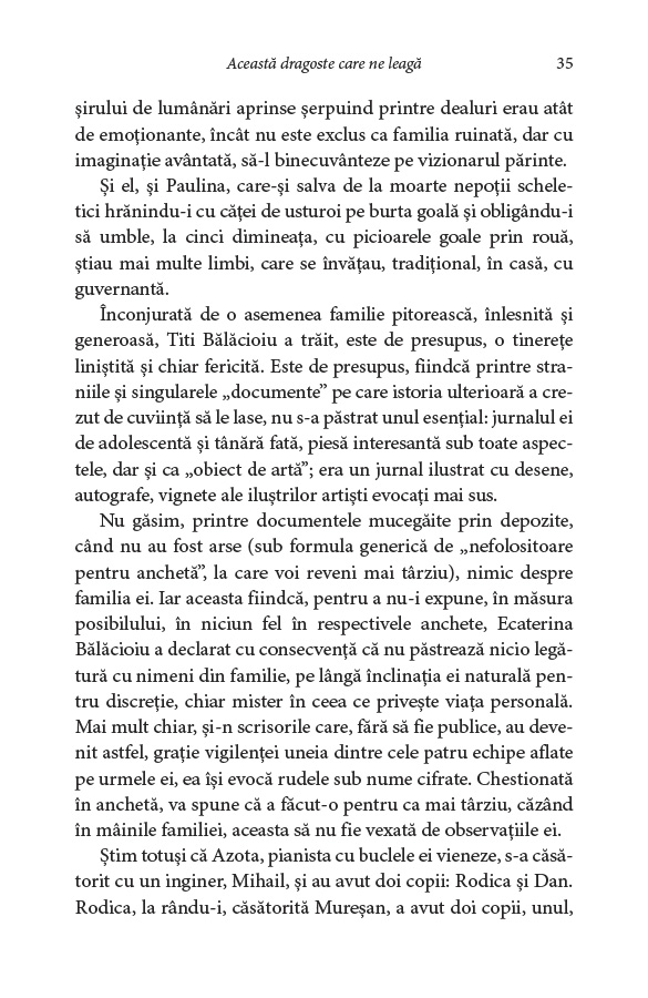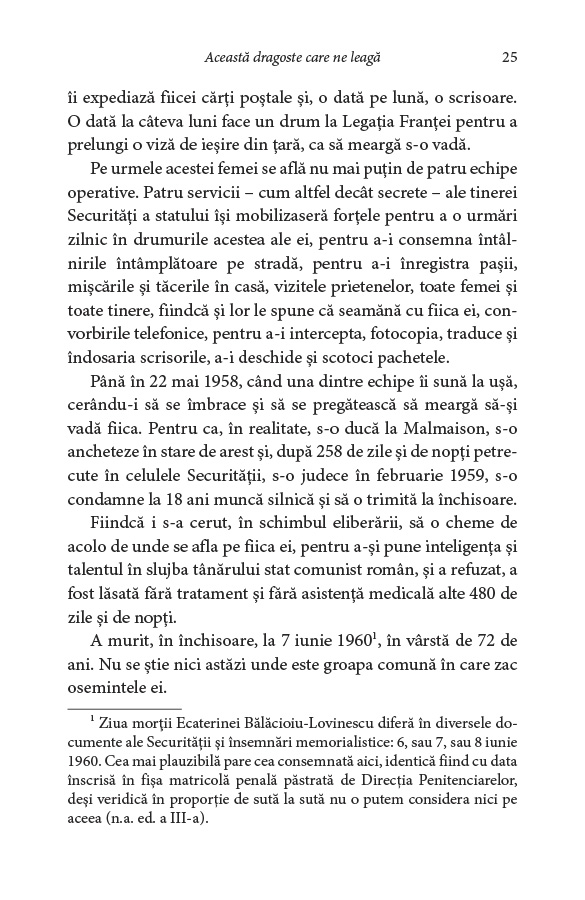 Tragedia vieții Ecaterinei Bălăcioiu‑Lovinescu și sfâșietoarea poveste de dragoste dintre ea și fiica ei, Monica Lovinescu – „această dragoste care ne leagă”, după cum repetă cele două ca într‑un canon –, romanul vieții lor în comunism și fresca unei epoci pline de violență și abuzuri.
