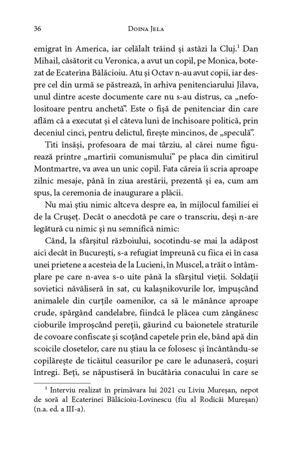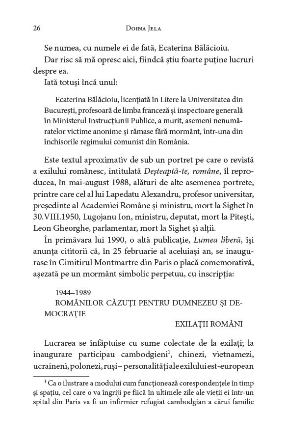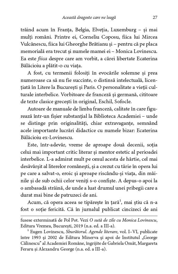„Noua versiune a necesitat note de subsol abundente și două adăugiri, plasate la sfârșitul listei de Anexe a volumului, referitoare la informațiile inedite apărute între timp. Prima este reprezentată de scurtul interviu cu unul dintre descendenții familiei Pleșoianu‑Bălăcioiu, din care provine Ecaterina Bălăcioiu‑Lovinescu, anume nepotul de soră, văr de‑al doilea al Monicăi Lovinescu, doctorul Liviu Mureșan, care trăiește la Cluj. [...] Un alt aspect al noutăților apărute în cei 18 ani trecuți de la prima ediție îl privește pe Virgil Ierunca. [...] Documente descoperite în arhivele Securității inaccesibile la data când eu am scris cartea au scos acum la iveală josnica presiune exercitată de Securitate asupra familiei Untaru. Documentele găsite de Clara Mareș [...] sunt adăugate tot în Anexe. Încărcătura lor emoțională este cu totul specială, iar ele întregesc portretul lui Virgil Ierunca și îi conferă acestuia, prin discreția, devotamentul, dragostea și sprijinul lui, o aură luminoasă.” Doina Jela, Câteva precizări la a treia ediție
