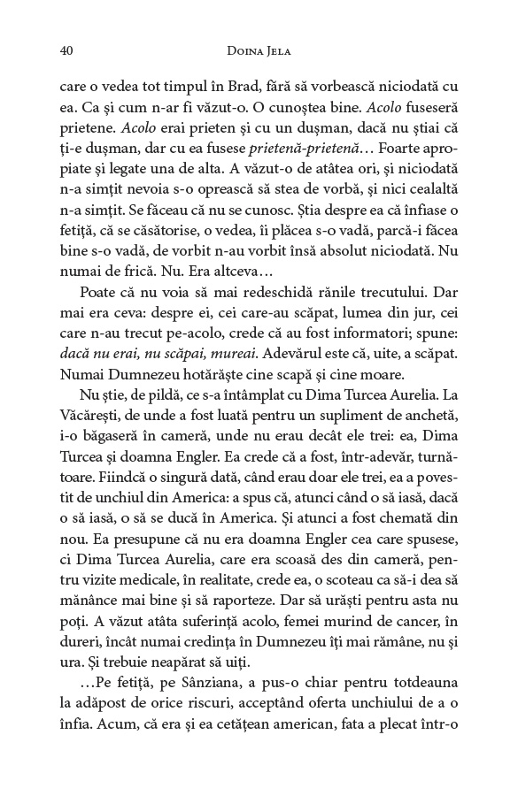 Descriind legătura puternică dintre o mamă – Ecaterina Bălăcioiu-Lovinescu (1887–1960), fosta soție a criticului literar Eugen Lovinescu – și fiica ei – Monica Lovinescu (1923–2008), unul dintre cei mai vocali opozanți ai regimului comunist, stabilită în Franța încă din 1947 –, Doina Jela prezintă ororile regimului comunist, nemilos cu cei pe care îi socotea „dușmanii” săi.