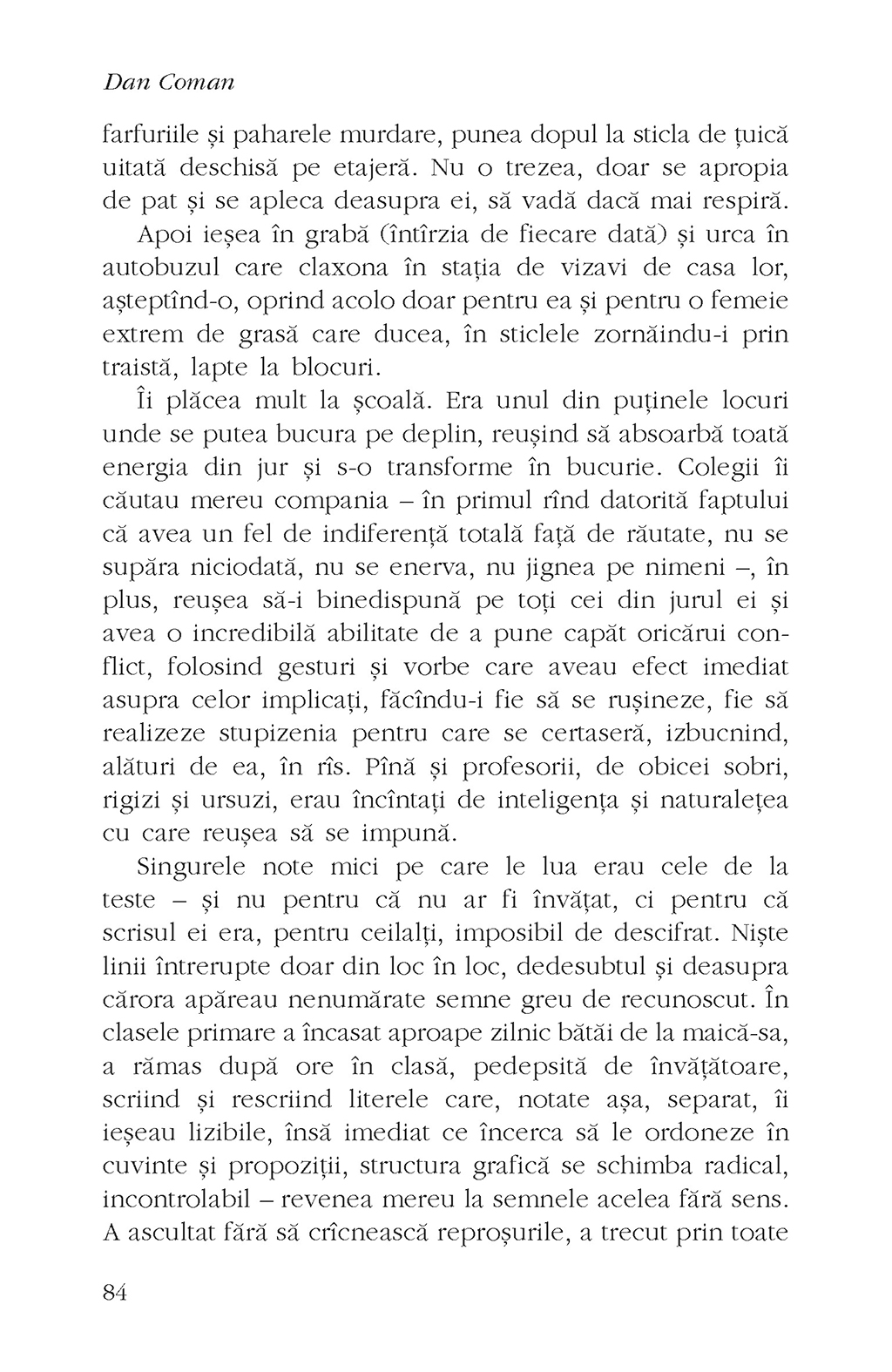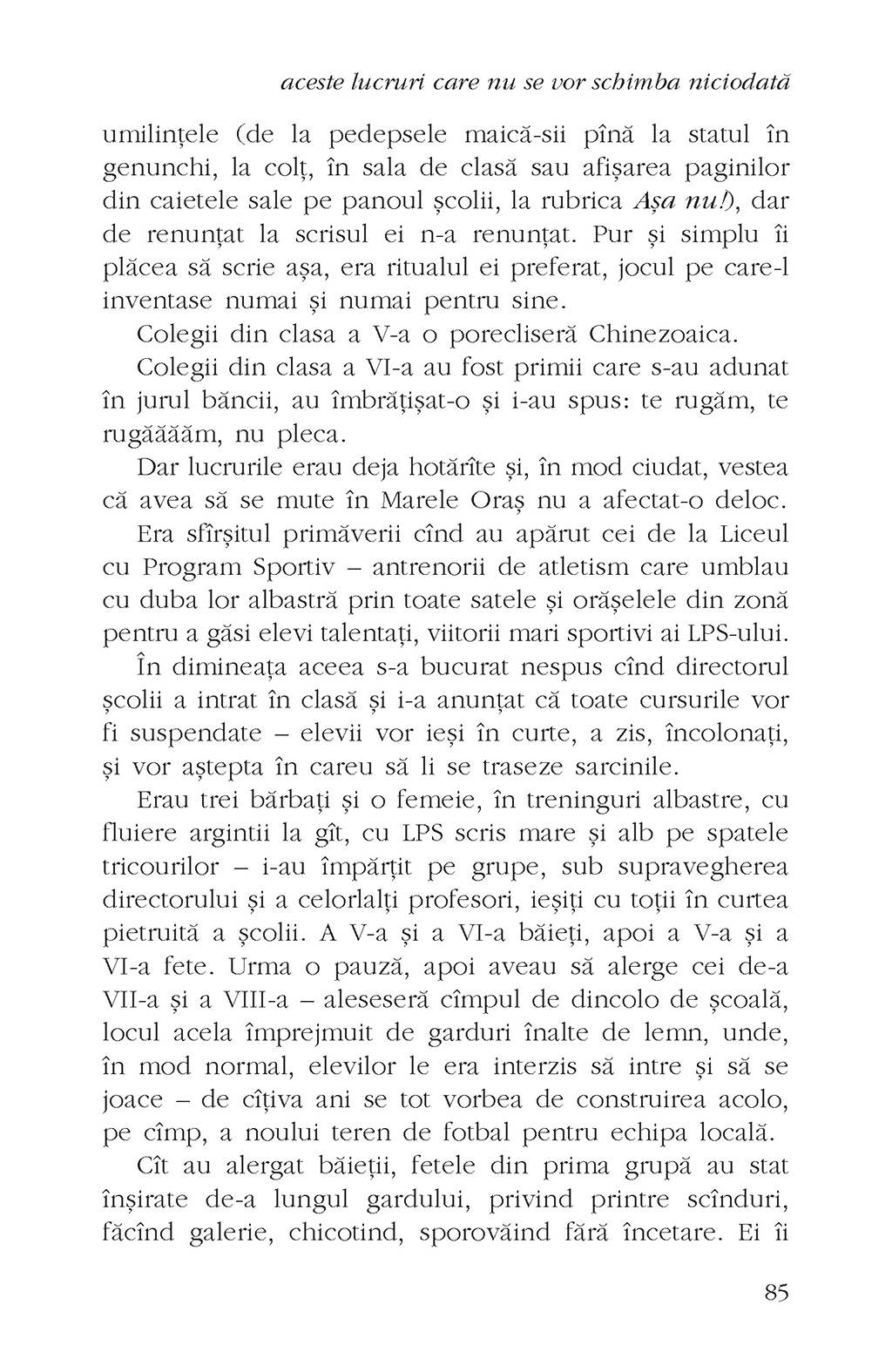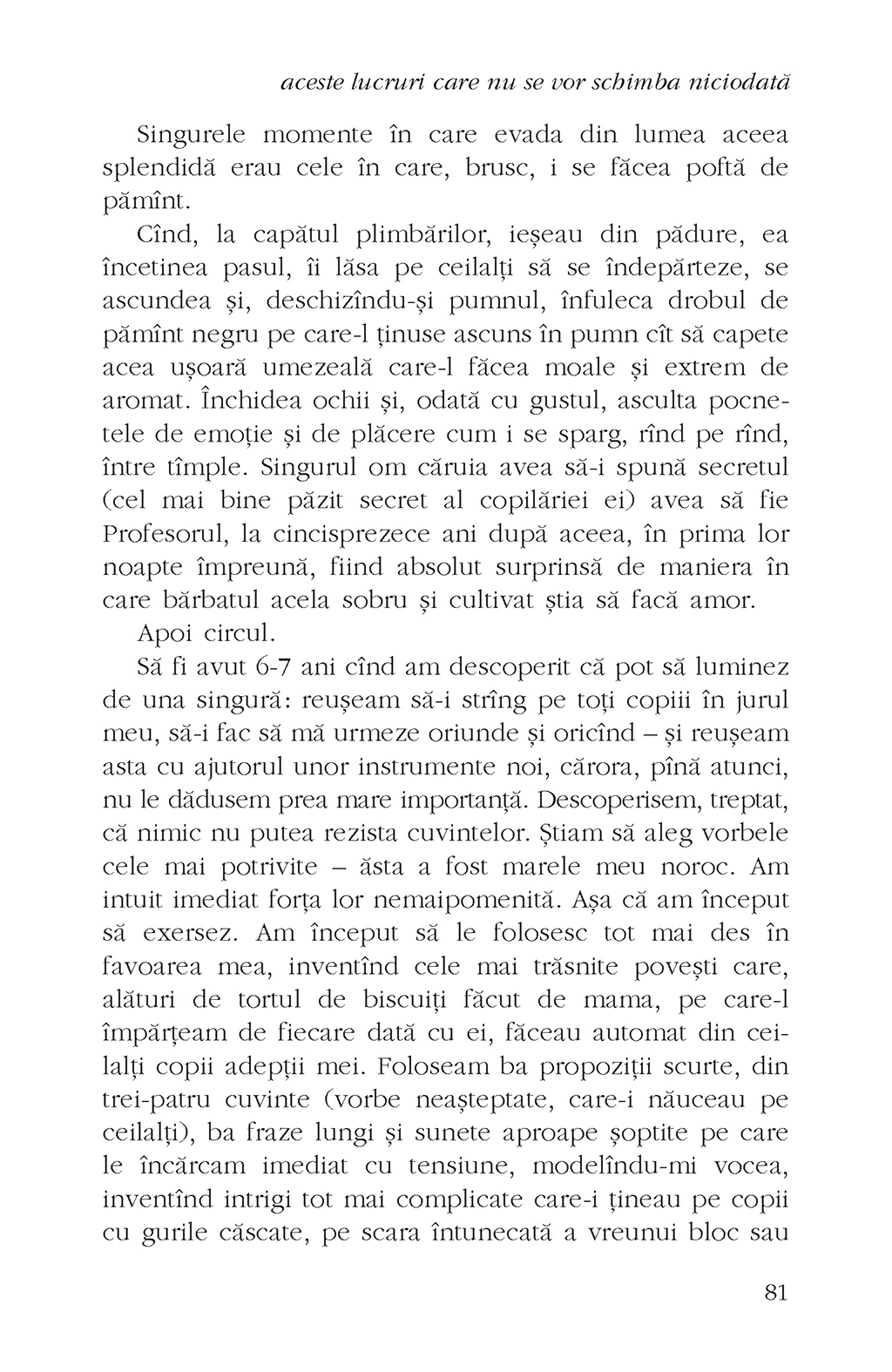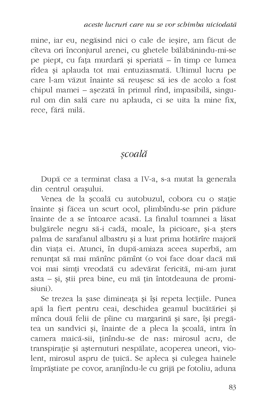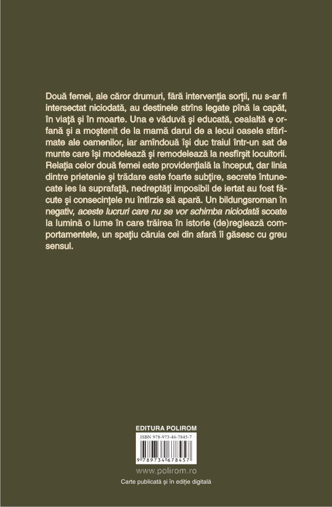 Două femei, ale căror drumuri, fără intervenţia sorţii, nu s-ar fi intersectat niciodată, au destinele strîns legate pînă la capăt, în viaţă şi în moarte. Una e văduvă şi educată, cealaltă e orfană şi a moştenit de la mamă darul de a lecui oasele sfărîmate ale oamenilor, iar amîndouă îşi duc traiul într-un sat de munte care îşi modelează şi remodelează la nesfîrşit locuitorii. Relaţia celor două femei este providenţială la început, dar linia dintre prietenie şi trădare este foarte subţire, secrete întunecate ies la suprafaţă, nedreptăţi imposibil de iertat au fost făcute şi consecinţele nu întîrzie să apară. Un bildungsroman în negativ, aceste lucruri care nu se vor schimba niciodată scoate la lumină o lume în care trăirea în istorie (de)reglează comportamentele, un spaţiu căruia cei din afară îi găsesc cu greu sensul.
