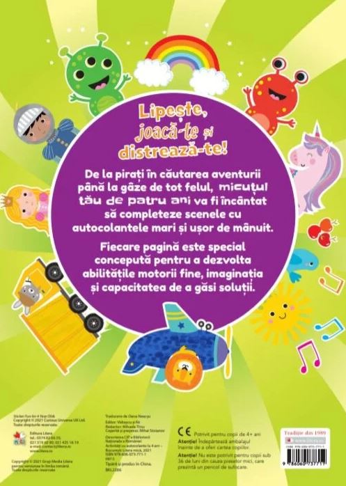 De la pirați în căutarea aventurii până la gâze de tot felul, micuțul tău de patru ani va fi încântat să completeze scenele cu autocolantele mari și ușor de mânuit.
