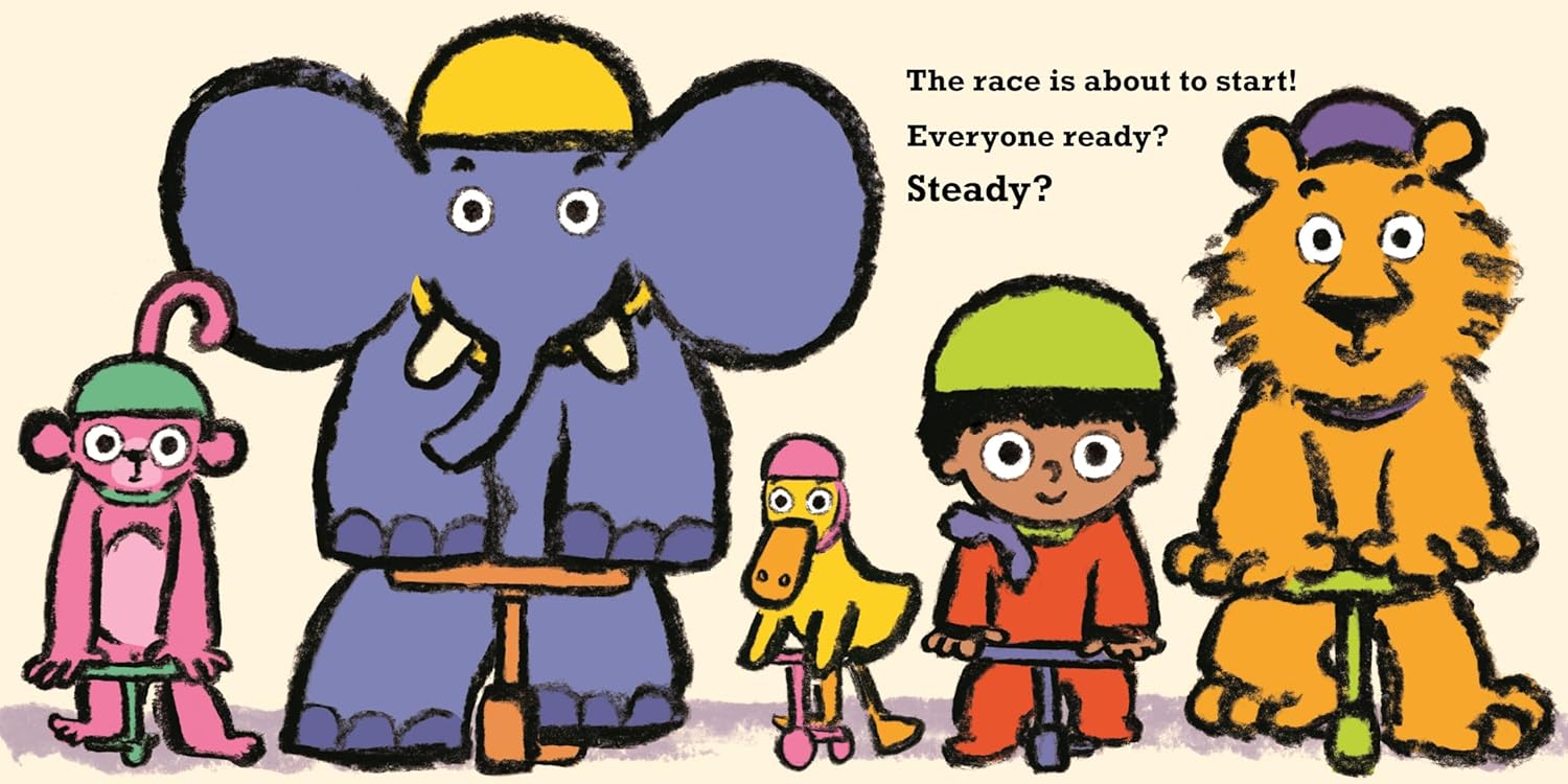 Ada's had a little fall. Not to worry - her pals all stop to make sure she's ok, and everyone crosses the finish line together!