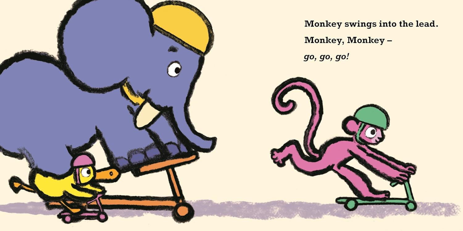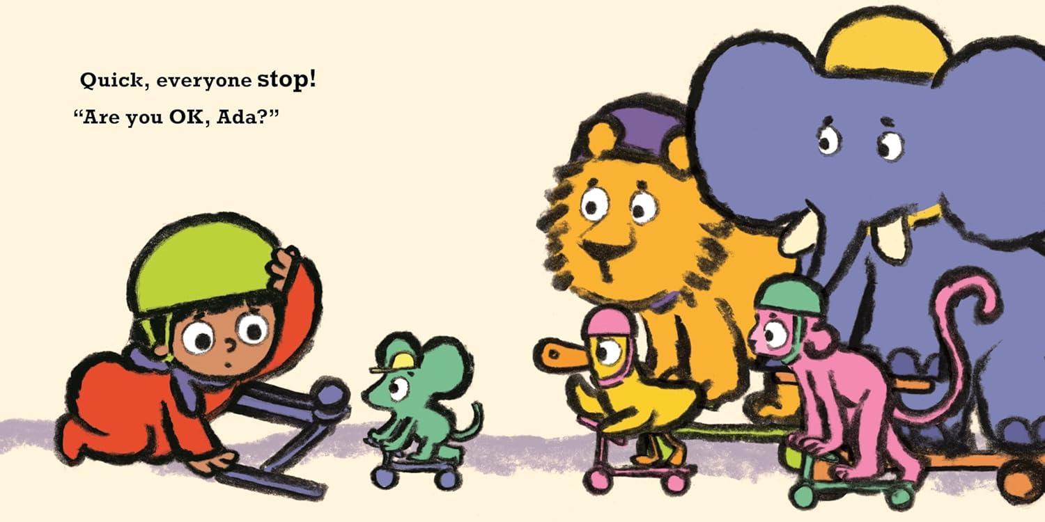 Ada and friends are lined up on their scooters, ready for the big race! Go, go, go! But - oops!