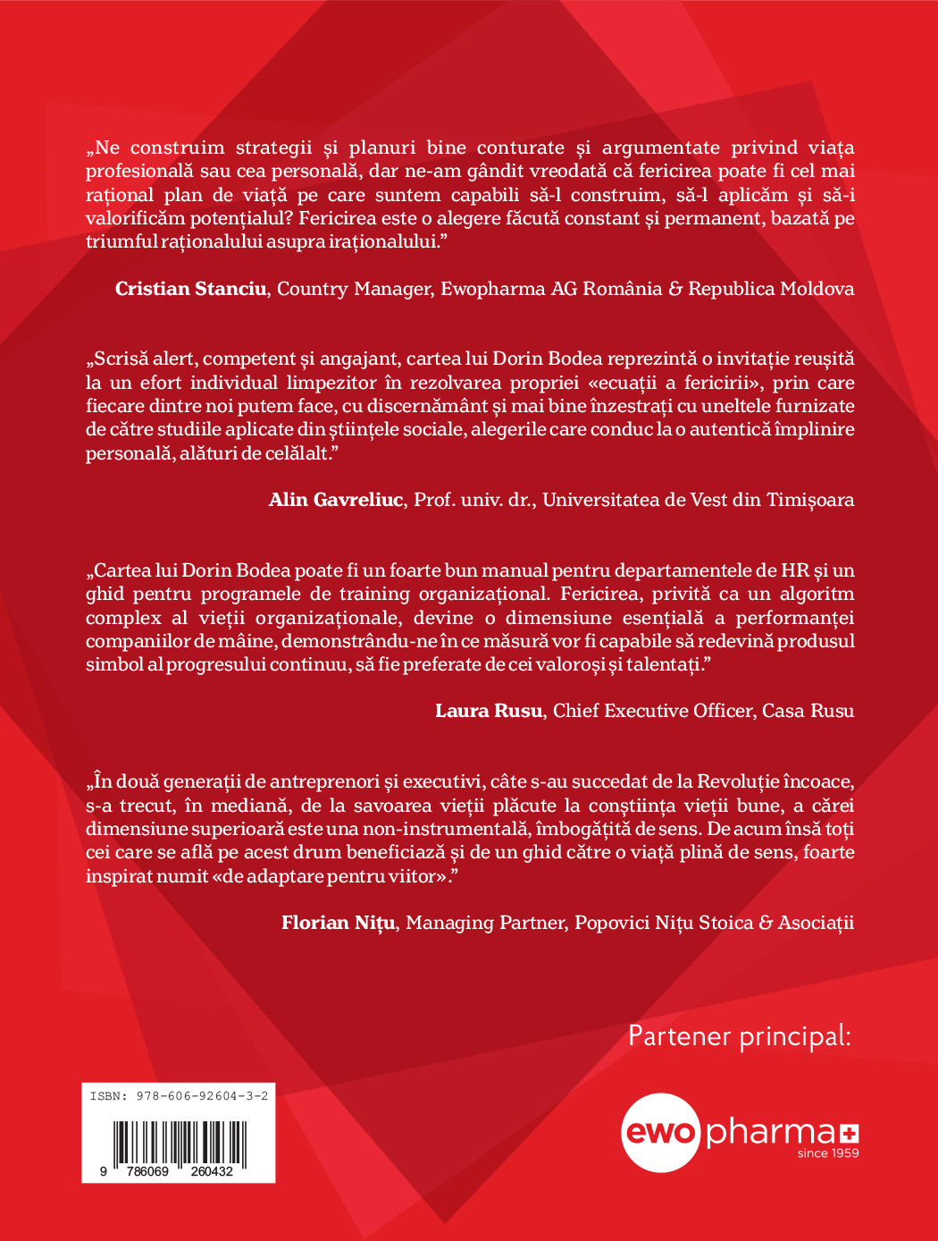 „Cartea lui Dorin Bodea poate fi un foarte bun manual pentru departamentele de HR si un ghid pentru programele de training organizaţional. Fericirea, privită ca un algoritm complex al vieţii organizaţionale, devine o dimensiune esenţială a performanţei companiilor de mâine, demonstrându-ne în ce măsură vor fi capabile să redevină produsul simbol alprogresului continuu, să fie preferate de cei valorosi si talentaţi."