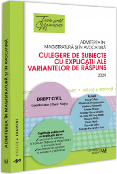 Realizata de un colectiv de autori cu mare experiența, format din judecatori, avocați și cadre didactice care predau la facultați de drept de prestigiu din țara, lucrarea Admiterea în magistratura si în avocatura. Culegere de subiecte cu explicatii ale variantelor de raspuns. Drept civil este utila candidaților la examenele de admitere în profesiile juridice, pentru concursul de admitere în magistratura, pentru examenele de admitere în profesia de avocat, de definitivare sau promovare, precum și studenților facultaților de drept, pentru examenul de licența.