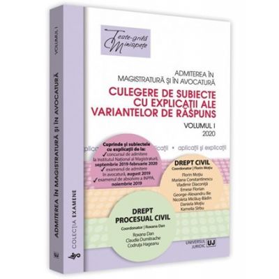 Realizata de un colectiv de autori cu mare experienta, format din procurori, judecatori, formatori ai Institutului National al Magistraturii, specialisti din Ministerul Justitiei, avocati si cadre didactice care predau la facultati de drept de prestigiu din tara, lucrarea Admiterea in magistratura si in avocatura. Culegere de subiecte cu explicatii ale variantelor de raspuns. Vol. I – Drept civil, Drept procesual civil este utila candidatilor la examenele de admitere in profesiile juridice, pentru concursul de admitere in magistratura, pentru examenele de admitere in profesia de avocat, de definitivare sau promovare, precum si studentilor facultatilor de drept, pentru examenul de licenta.
