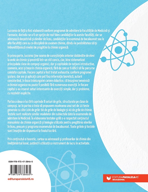 Partea a doua a lucrării cuprinde 8 seturi de grile, structurate pe clase de compuși, iar în partea a treia vă propunem rezolvarea unui set de 10 teste generale cu câte 100 de grile: 60 de grile de biologie și 40 de grile de chimie. Testele sunt realizate similar modelelor din subiectele date la examenele de admitere la Medicină. În elaborarea testelor-grilă s-a respectat conținutul manualelor de chimie organică și biologie utilizate pentru pregătirea elevilor în liceu, precum și programa examenului de bacalaureat. Toate grilele și testele sunt însoțite de răspunsuri la finalul lucrării.