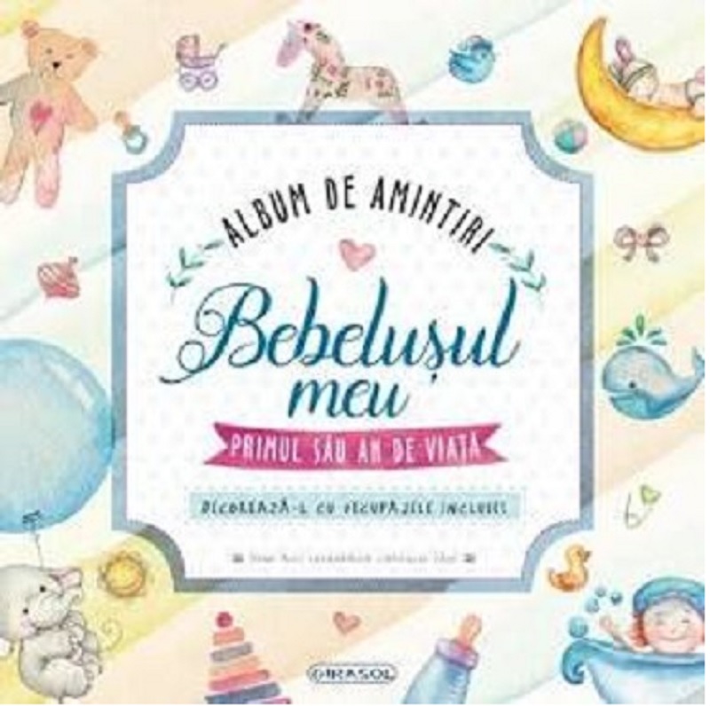 Primul an din viata bebelusului tau este minunat, iar acest superb album de amintiri te ajuta sa pastrezi cele mai frumoase momente. In el poti nota intamplari hazlii, date importante si alte momente de neuitat, poti lipi cele mai frumoase fotografii si il poti decora cu decupajele incluse.