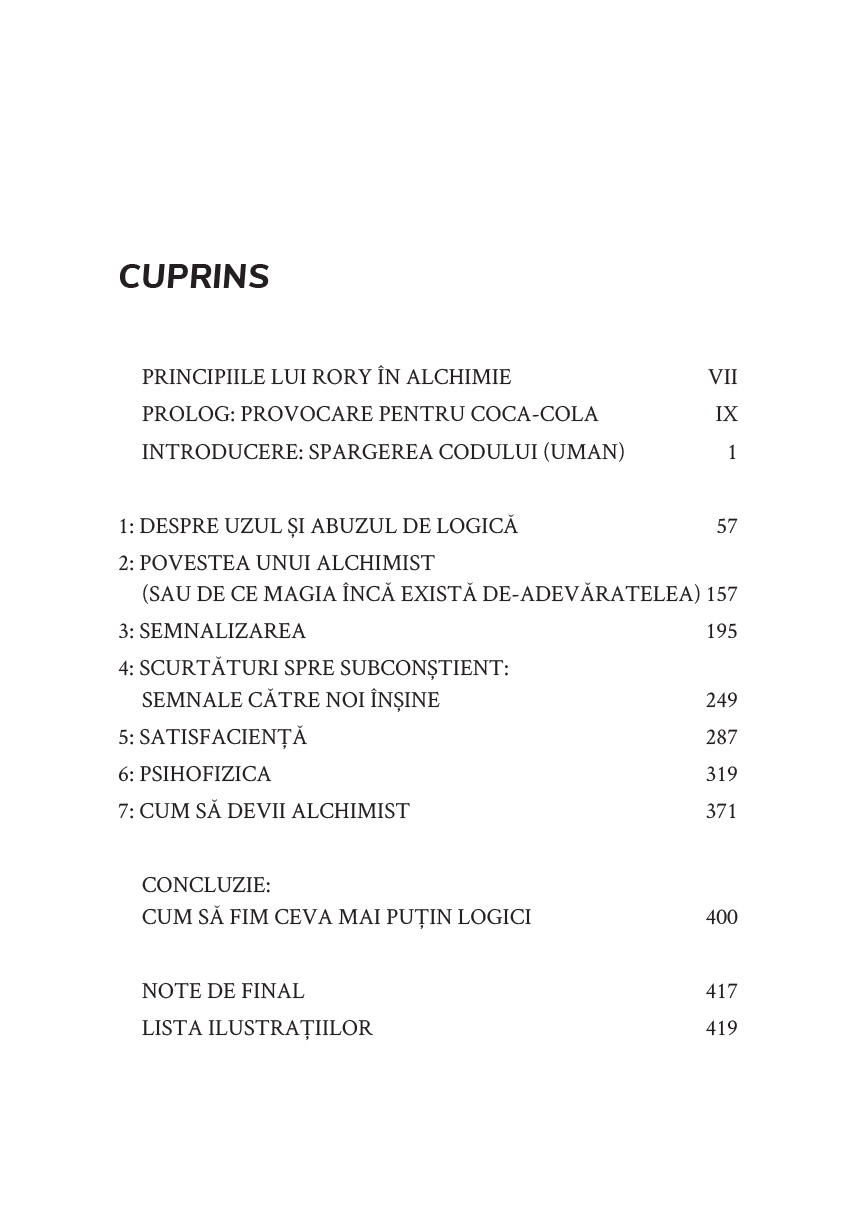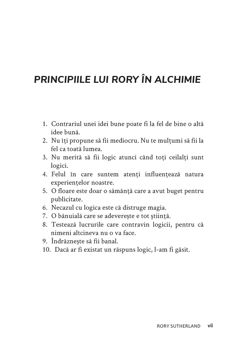 Rezultatul a treizeci de ani de experiență practică în miezul celui mai amplu experiment conceput vreodată în ce privește comportamentul uman – mereu surprinzătorul capitalism consumerist – Alchimie, volumul revoluționar scris de Rory Sutherland, o legendă în lumea publicității, ale cărui conferințe TED au peste șapte milioane de vizionări, descifrează tainele comportamentului uman, împletind rezultate de ultimă oră ale cercetărilor științifice cu stilul unui povestitor savuros, cu înțelegerea rafinată a unor subtilități psihologice și cu studii de caz practice adunate de-a lungul unei cariere impresionante în proximitatea unor clienți cum sunt AmEx, Microsoft și alții.
